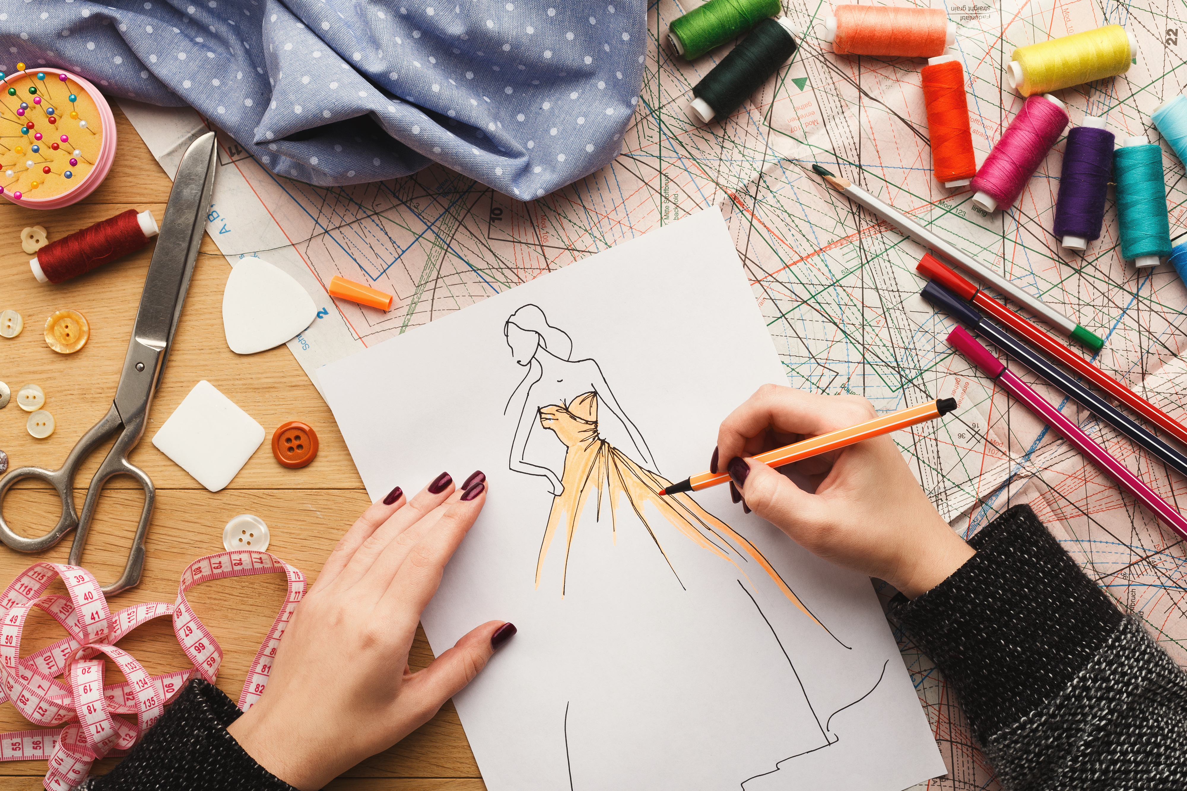 Created with an image by Prostock-studio - "Top view on woman designer drawing clothes sketches"