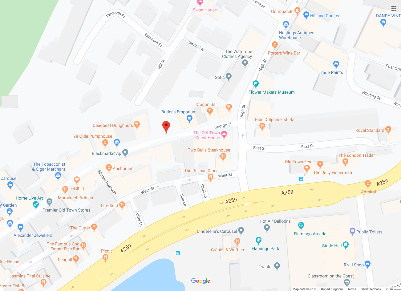The meeting place for the Hastings tours is at 'Butlers Gap' in George Street, Hastings located next to Butlers Emporium. There is a large chessboard painted on the floor and an information board at the front.
