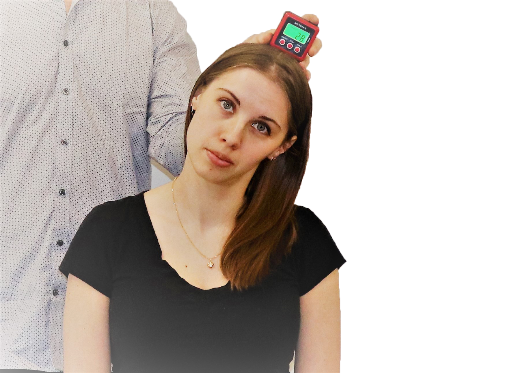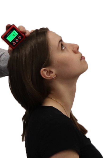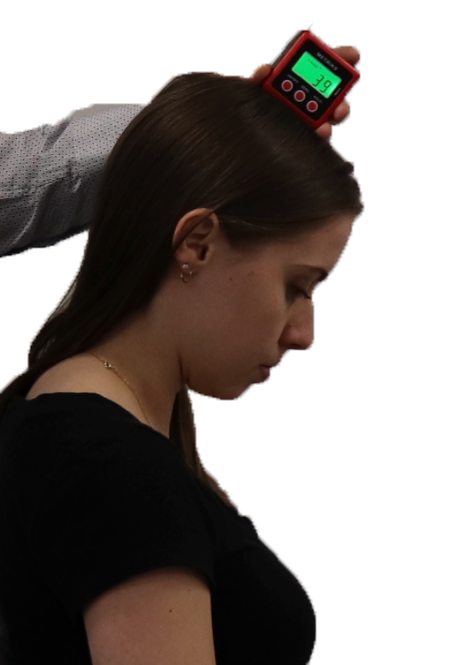 Place the inclinometer on the top of the client's head and ask them to bend their head to the left. When the individual reaches their maximum range of motion press the HOLD button. Record the measurement before having the client return to neutral position and press the HOLD button to reset the inclinometer to reset. Repeat this process for the right side.