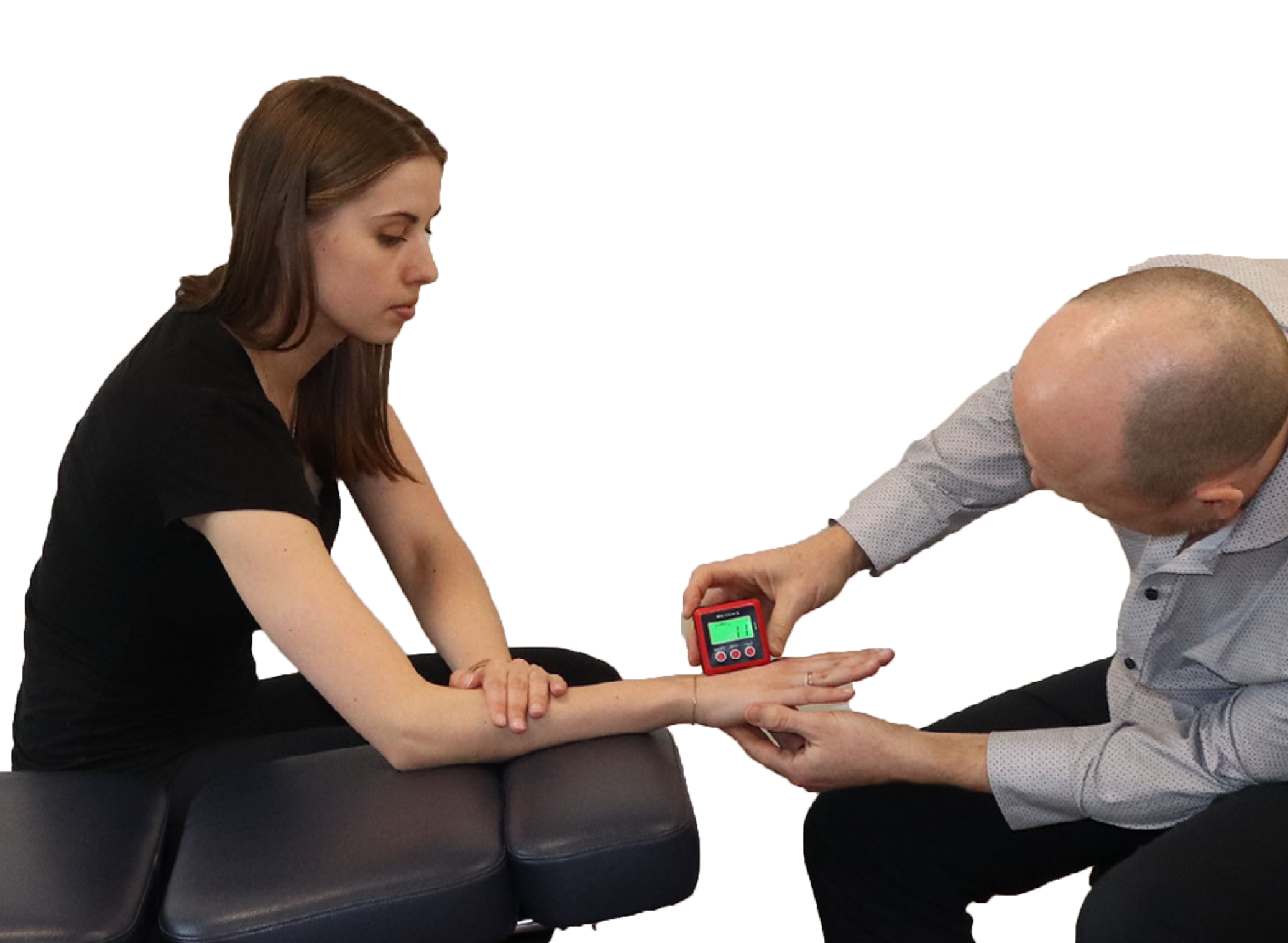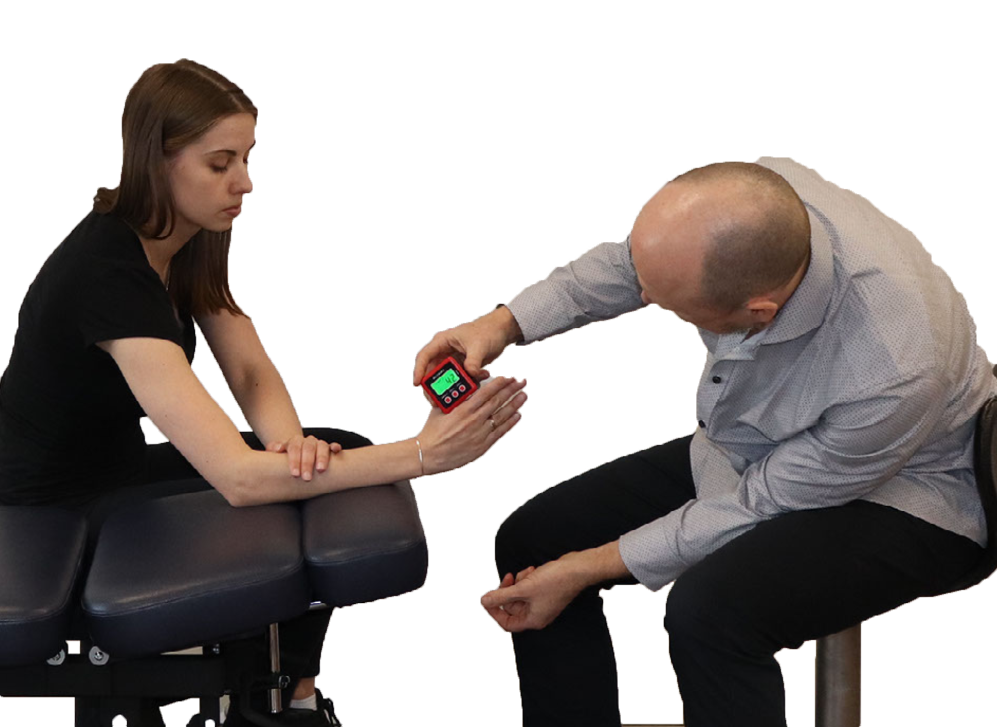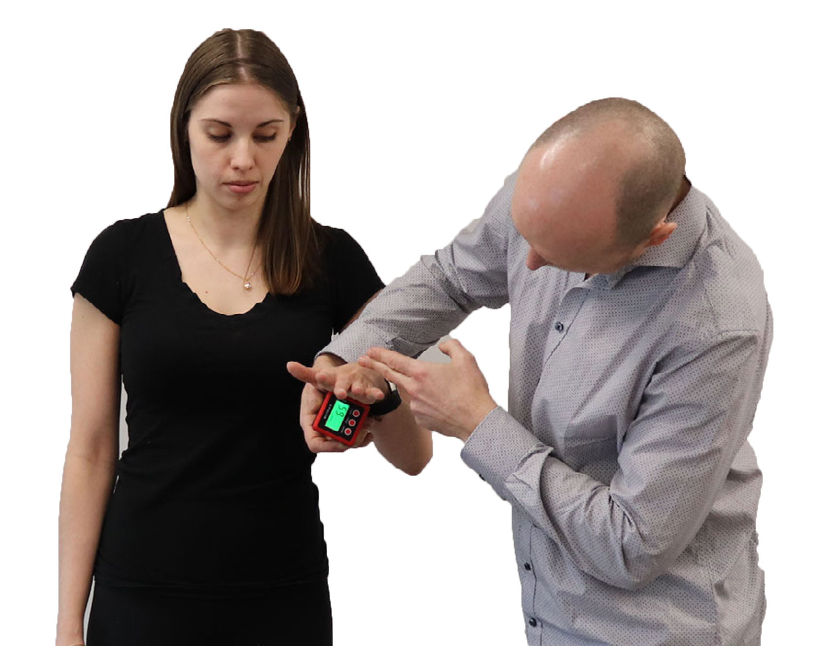 While individual is in the neutral position, place the main unit on the LEFT hand. Ask the individual to EXTEND their LEFT WRIST completely. When the individual has reached the maximum range of motion, press the HOLD button. RECORD the score.