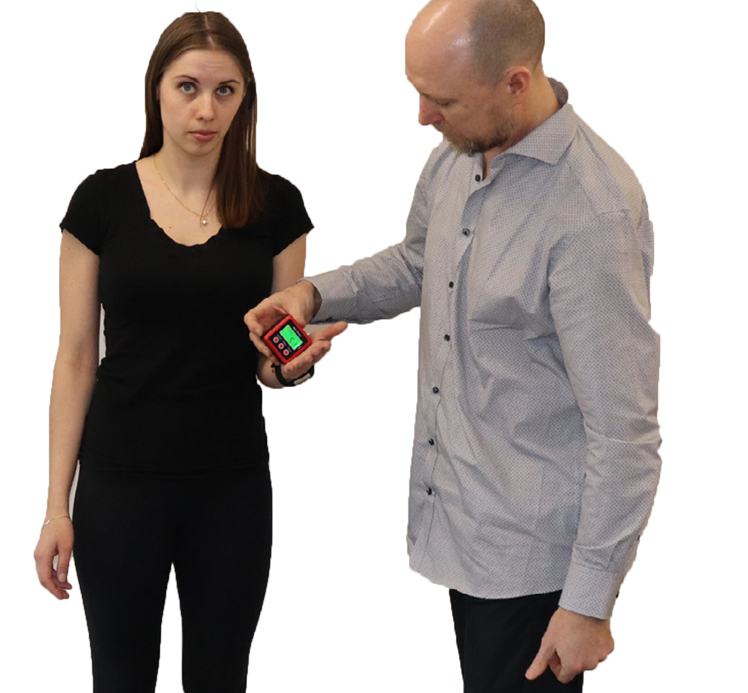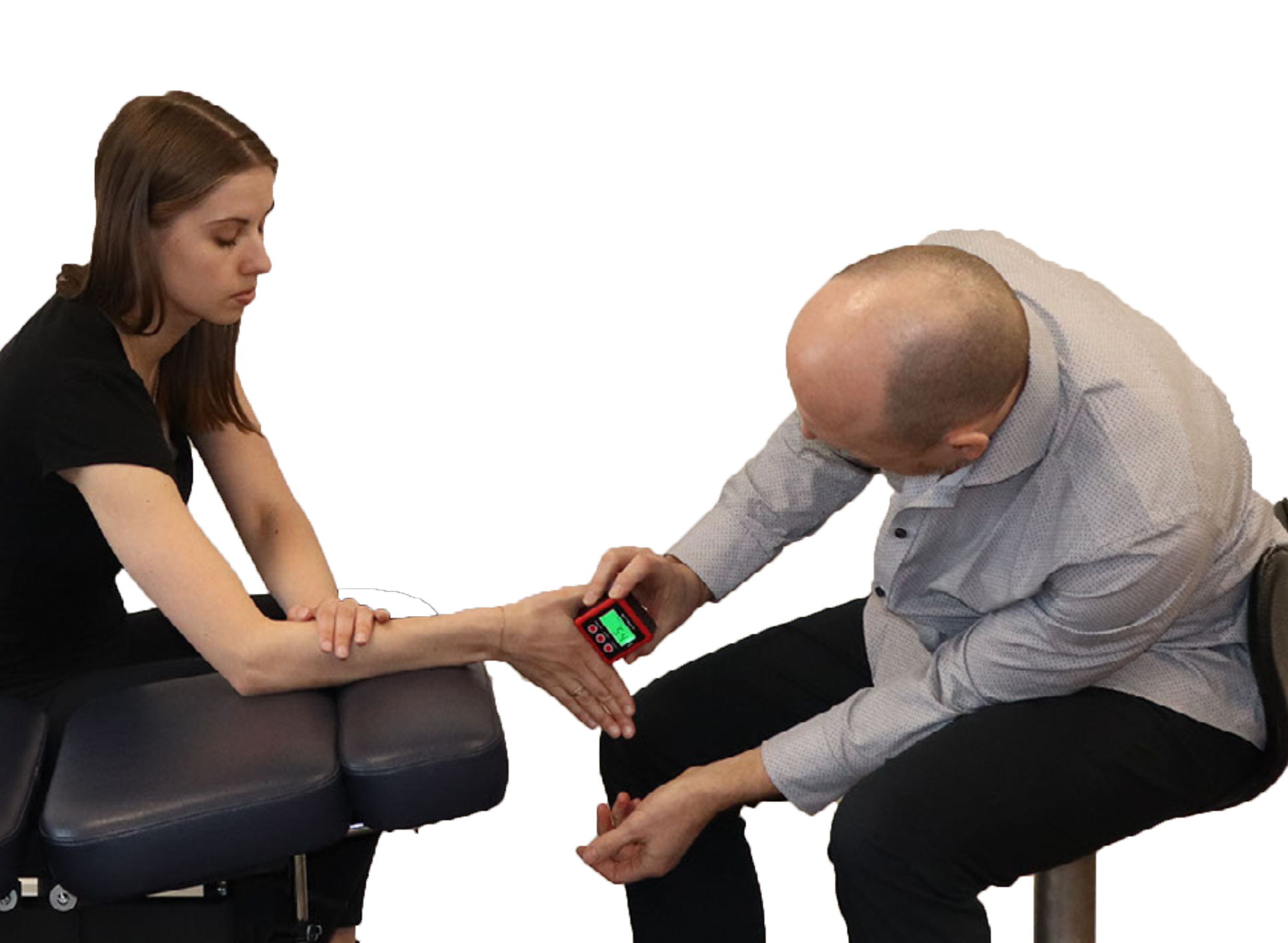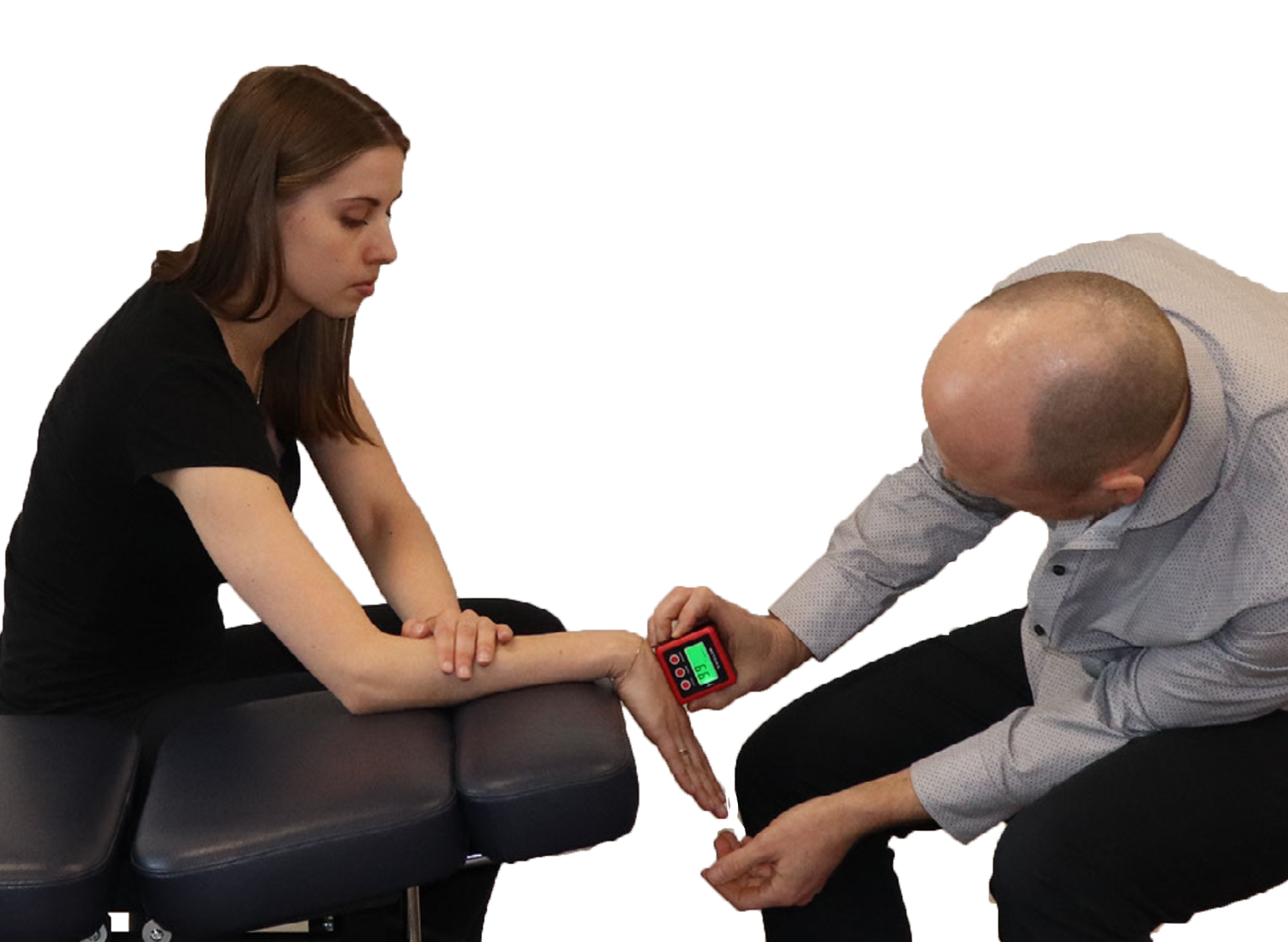 While individual is in the neutral position, place the main unit on the LEFT hand. Ask the individual to EXTEND their LEFT WRIST completely. When the individual has reached the maximum range of motion, press the HOLD button. RECORD the score.