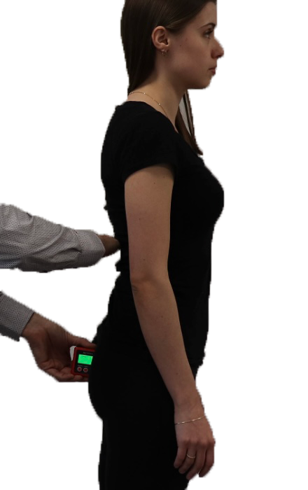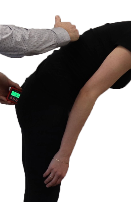 S2 Extension: While individual is in the neutral position place the inclinometer on the S2 spinous process. Press the ZERO button and then ask the individual to EXTEND backward completely. When the individual has reached the maximum range of motion, press the HOLD button. RECORD the score.