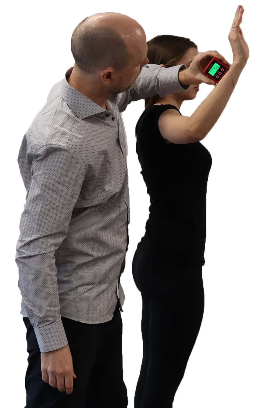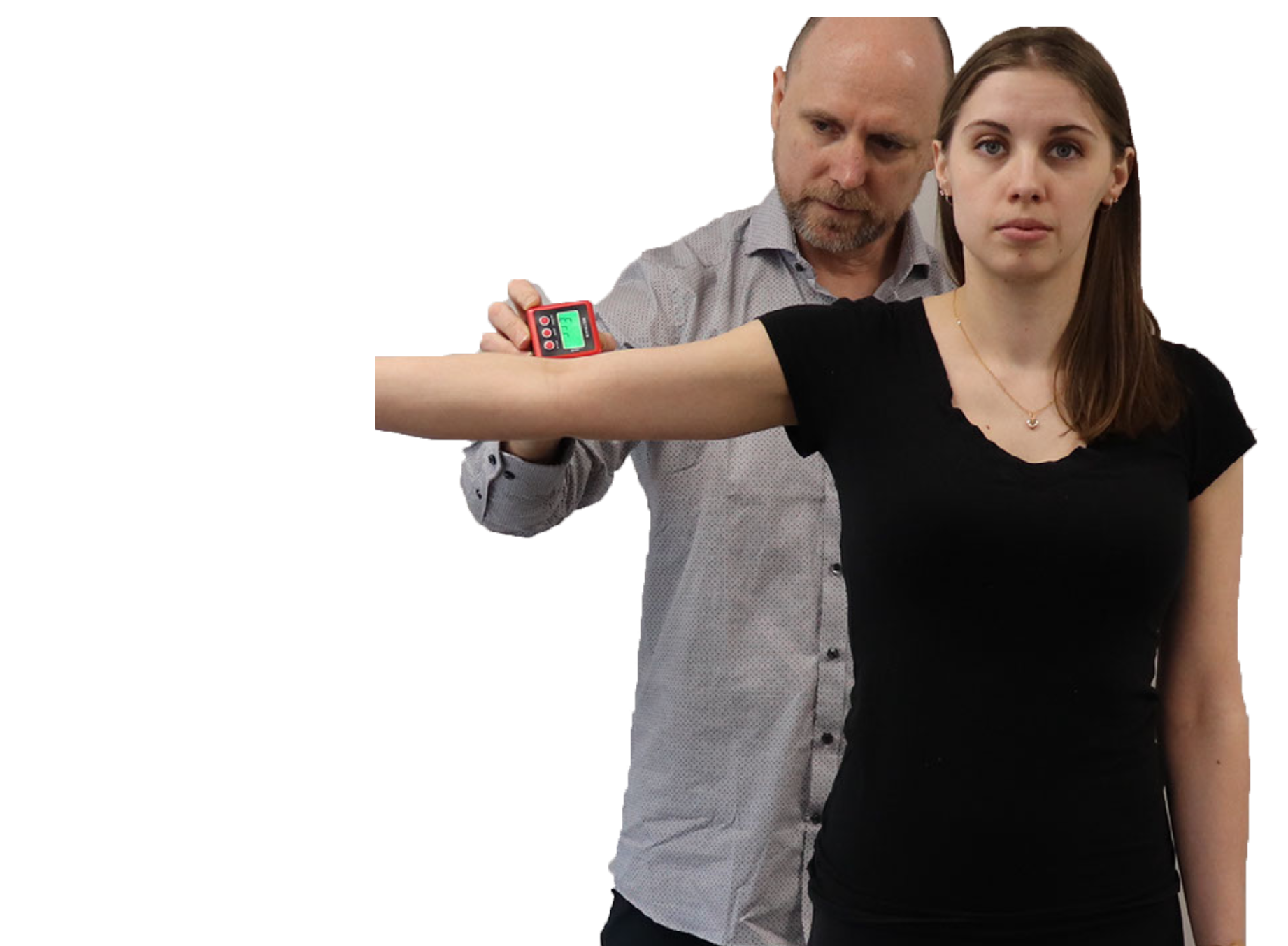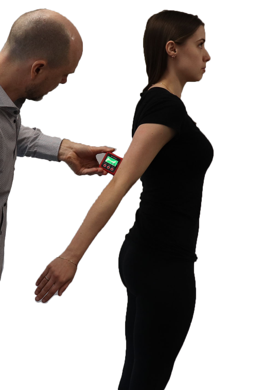 While individual is in the neutral position, place the main unit on the LEFT humorous. Ask the individual to EXTEND their LEFT SHOULDER completely. When the individual has reached the maximum range of motion, press the HOLD button. RECORD the score.