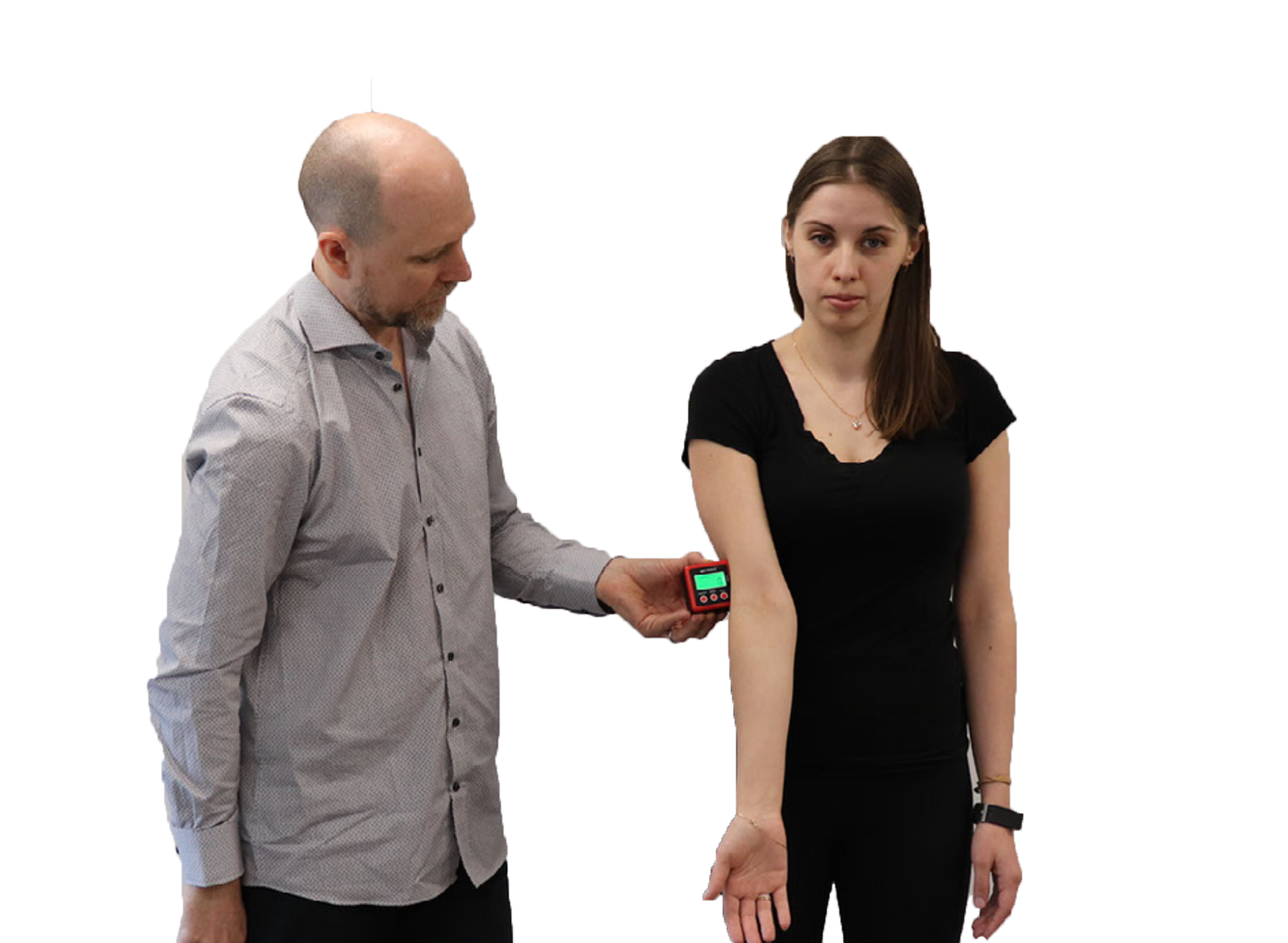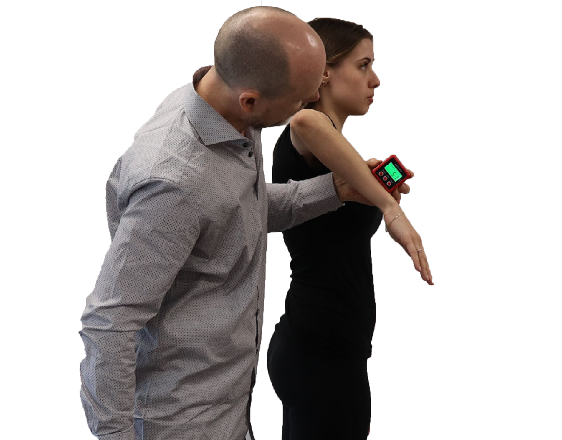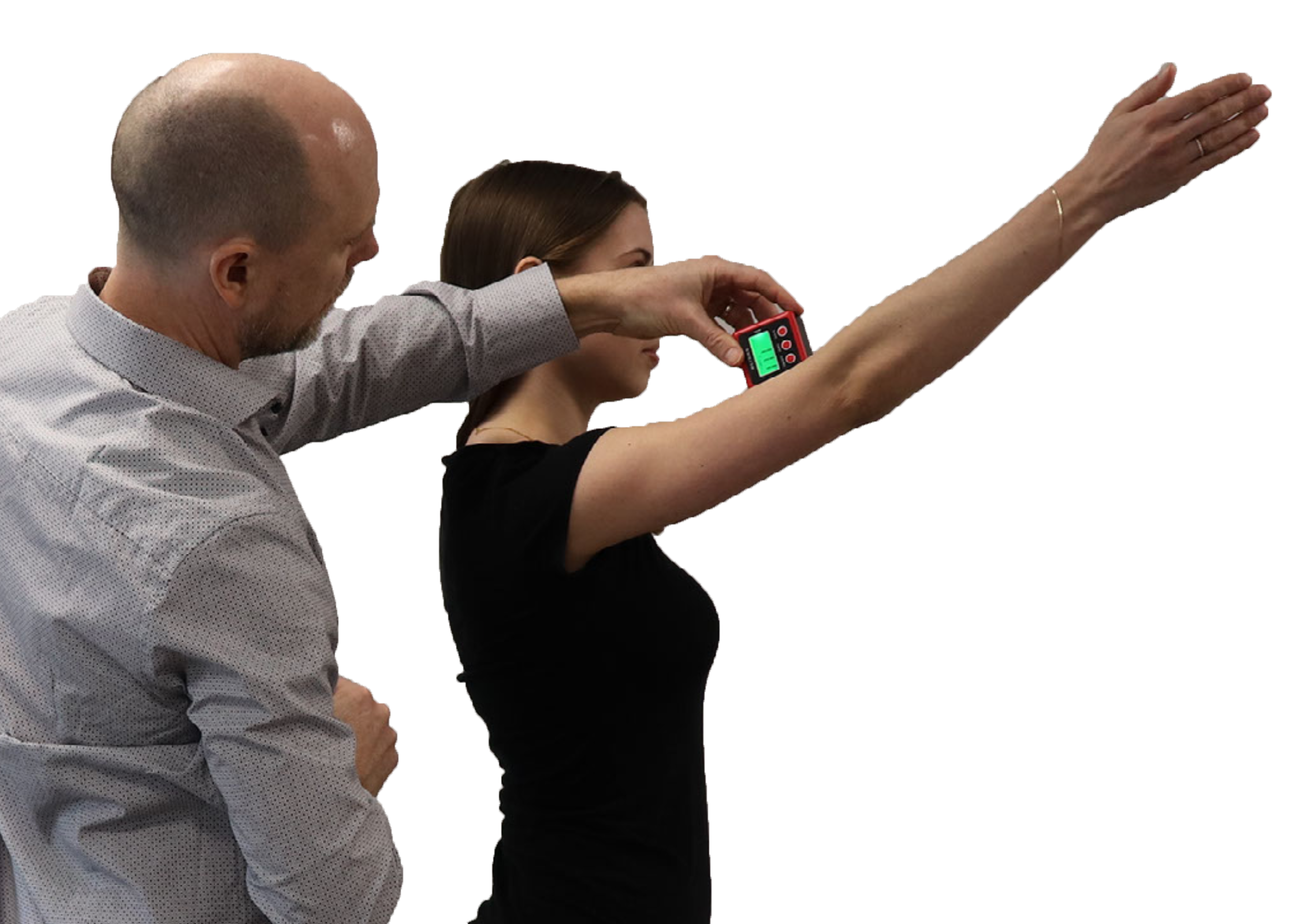 While individual is in the neutral position, place the main unit on the LEFT humorous. Ask the individual to EXTEND their LEFT SHOULDER completely. When the individual has reached the maximum range of motion, press the HOLD button. RECORD the score.