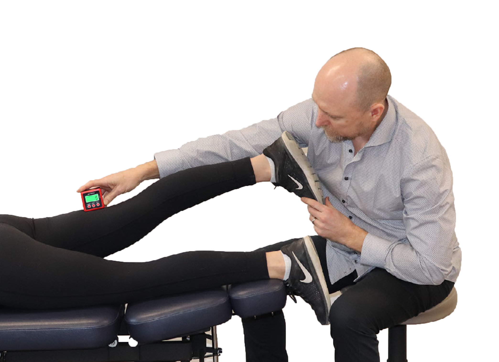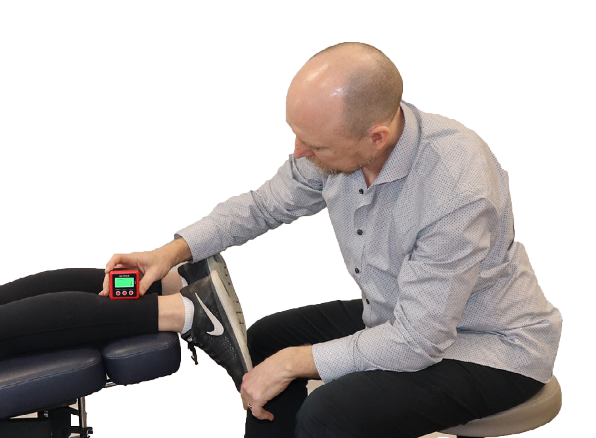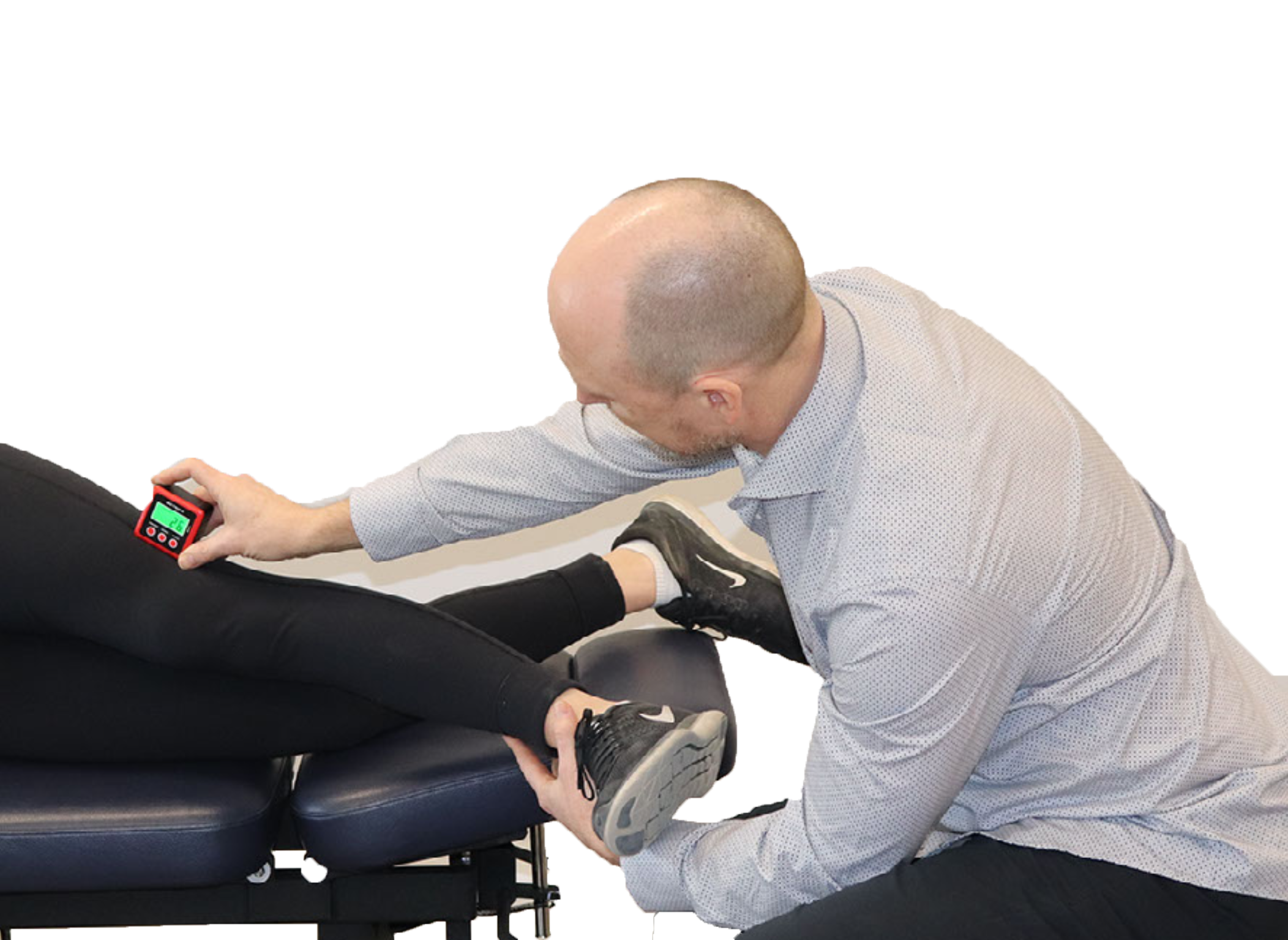 Dorsiflexion: While individual is in the neutral position, place the inclinometer on the LEFT foot Ask the individual to FLEX their LEFT ANKLE completely. When the individual has reached the maximum range of motion, press the HOLD button.
