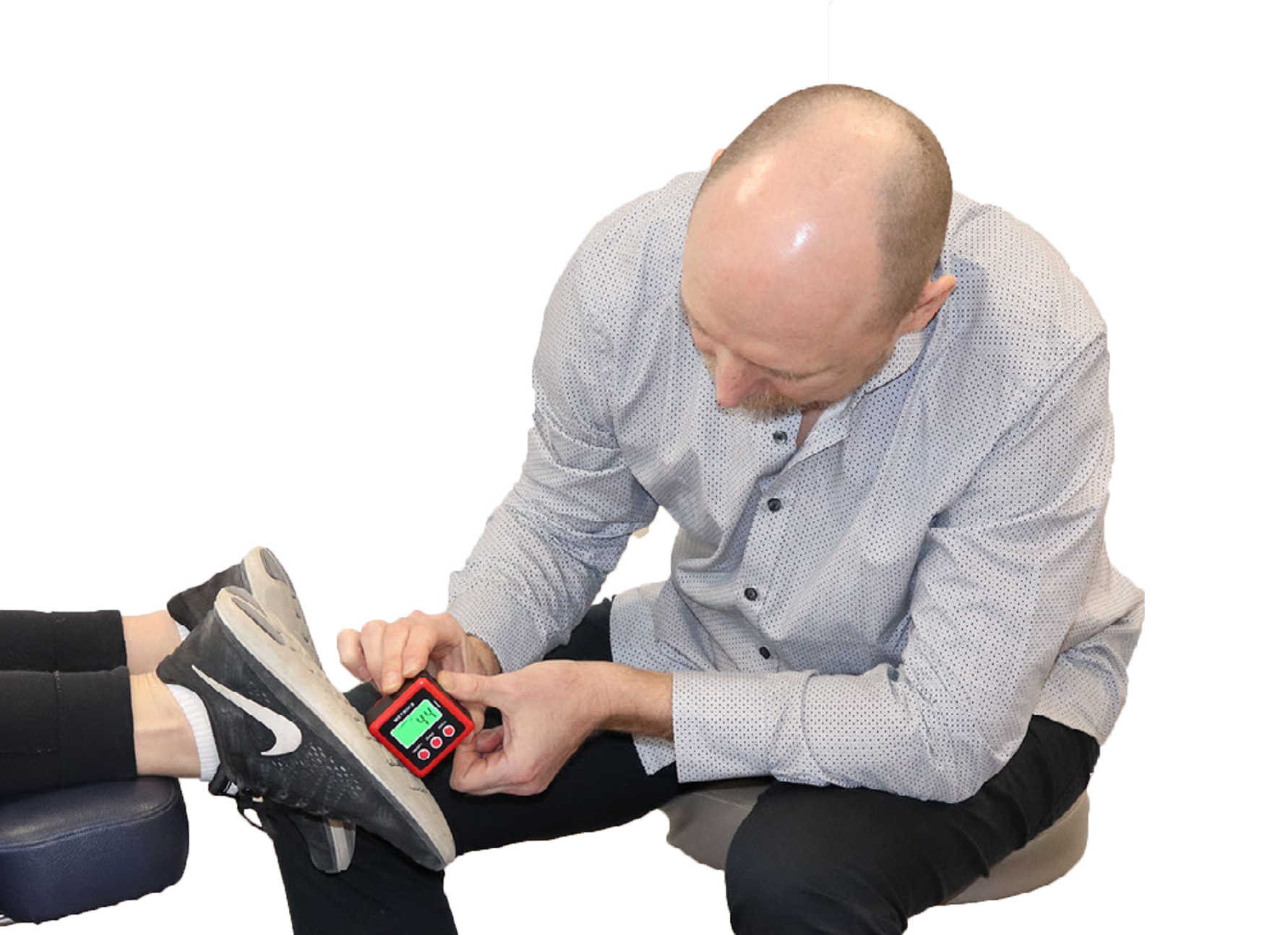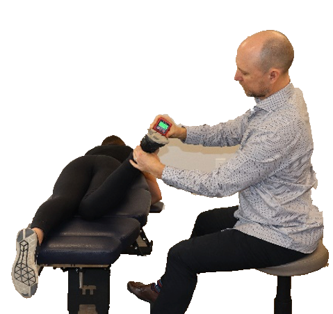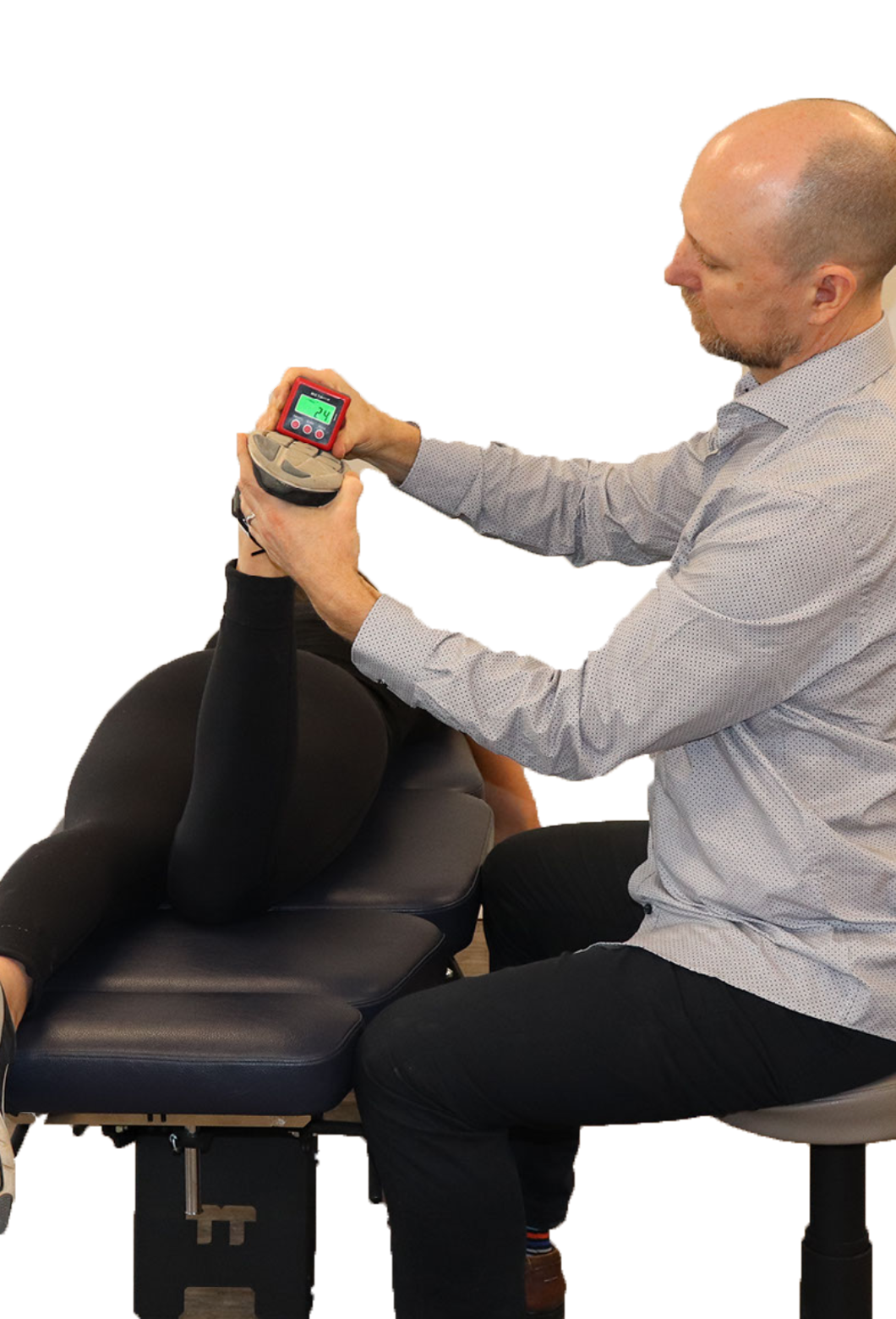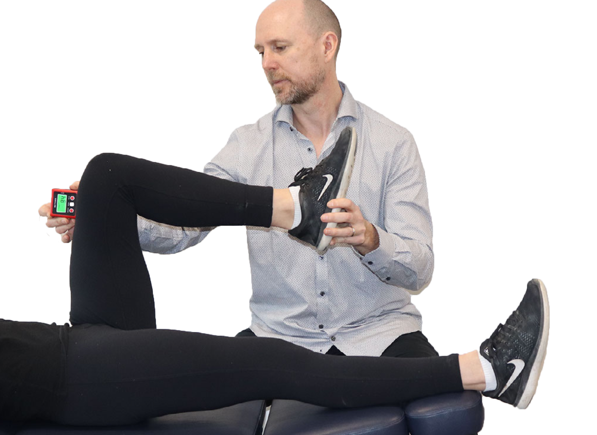 Dorsiflexion: While individual is in the neutral position, place the inclinometer on the LEFT foot Ask the individual to FLEX their LEFT ANKLE completely. When the individual has reached the maximum range of motion, press the HOLD button.