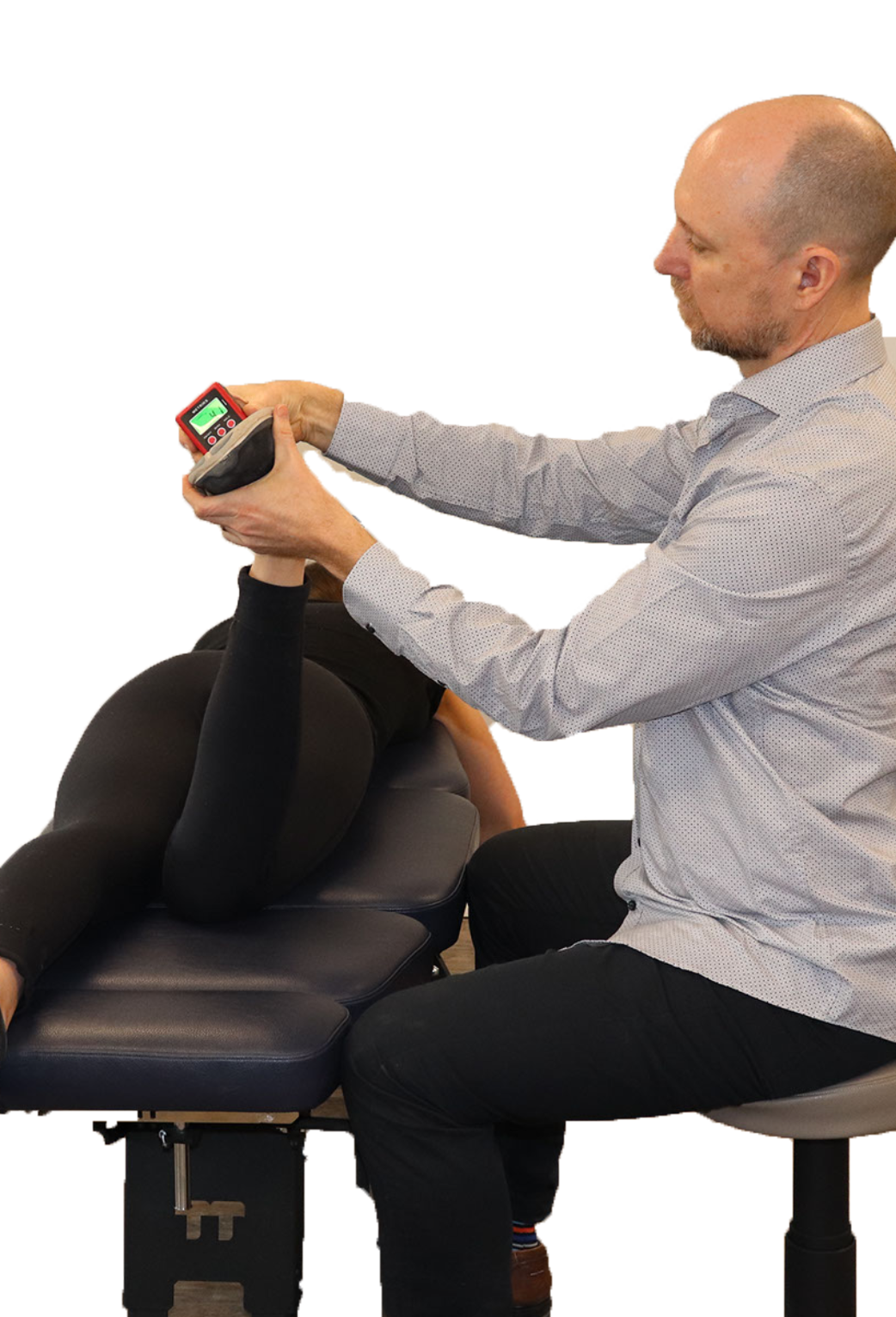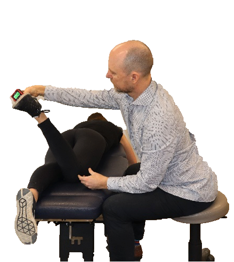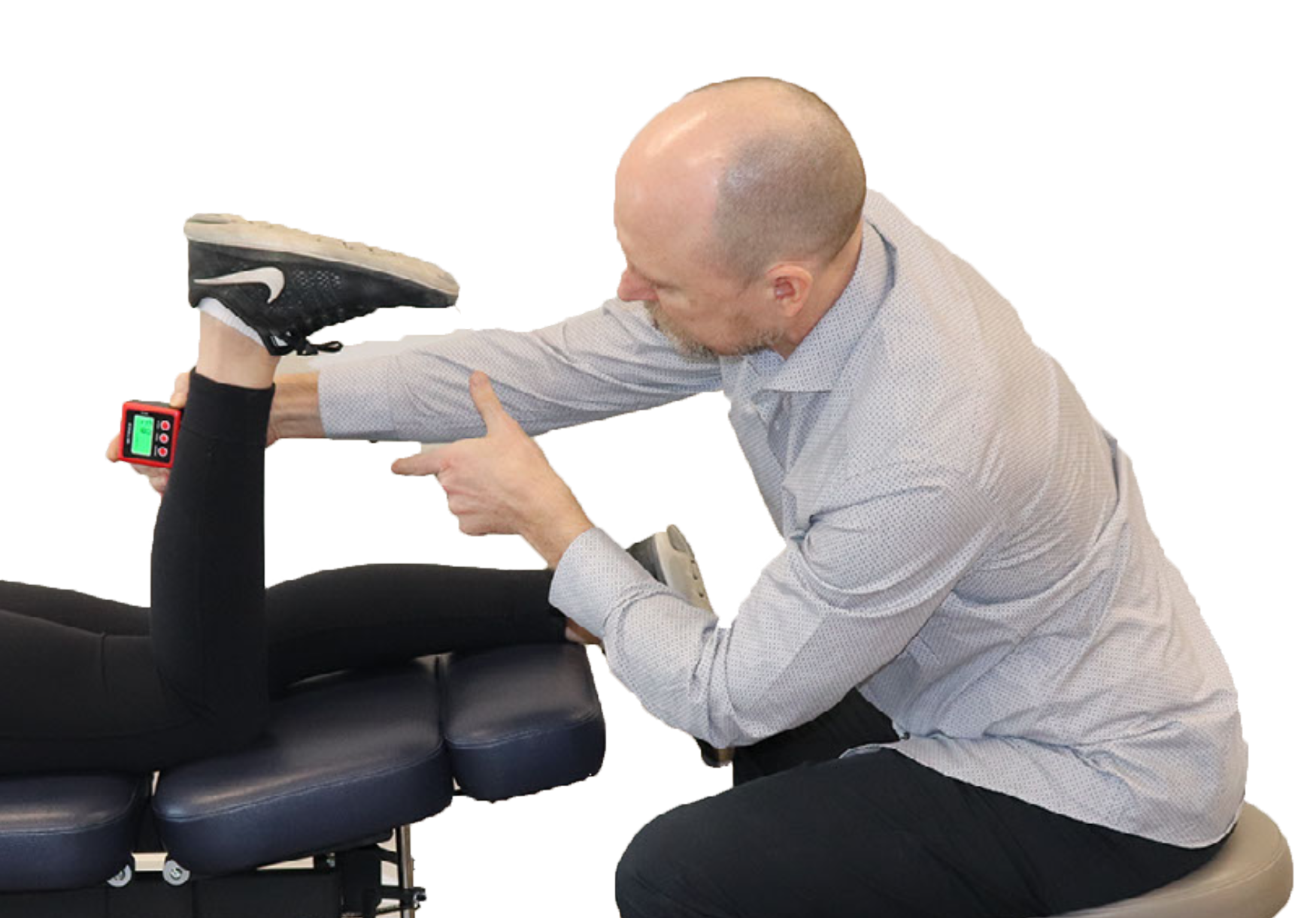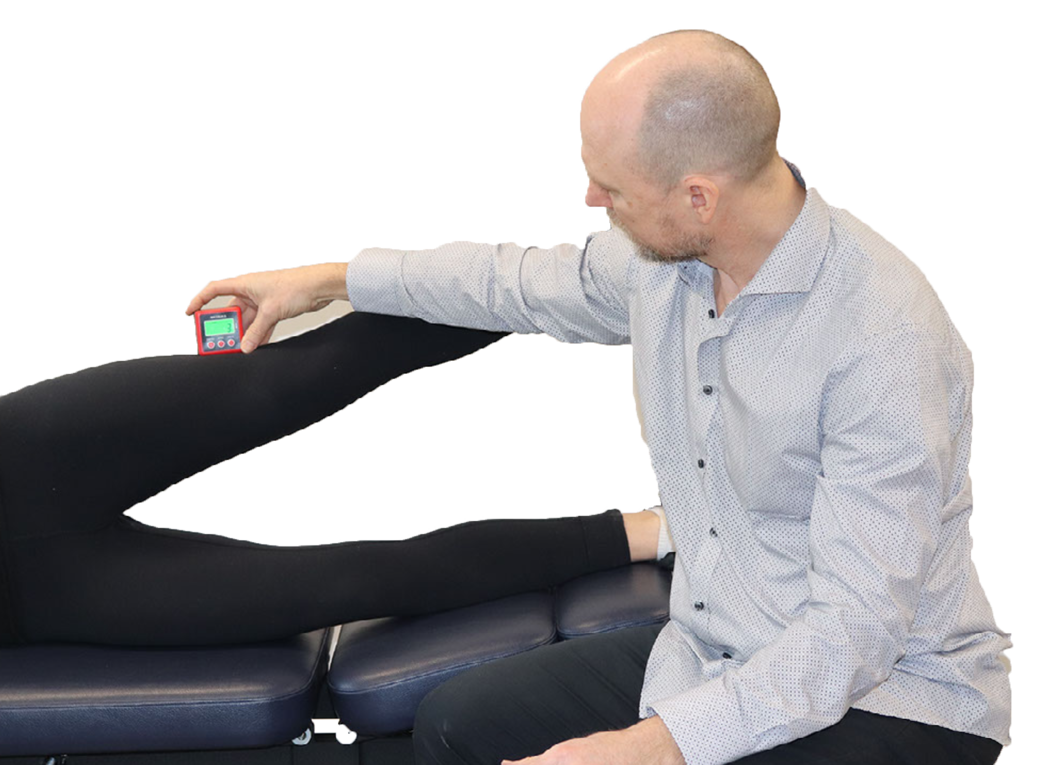 External Rotation: Use the vertical ZERO method: Place inclinometer on against a flat surface and press ZERO. While individual is in the neutral position, place the inclinometer on the LEFT leg Ask the individual to EXTERNALLY ROTATE their LEFT HIP completely. When the individual has reached the maximum range of motion, press the HOLD button