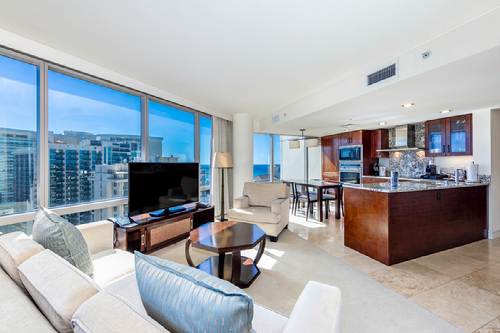 Primary Living Area with view stretching from the Koolau Mountains to partial Diamond Head views to the Pacific Ocean.