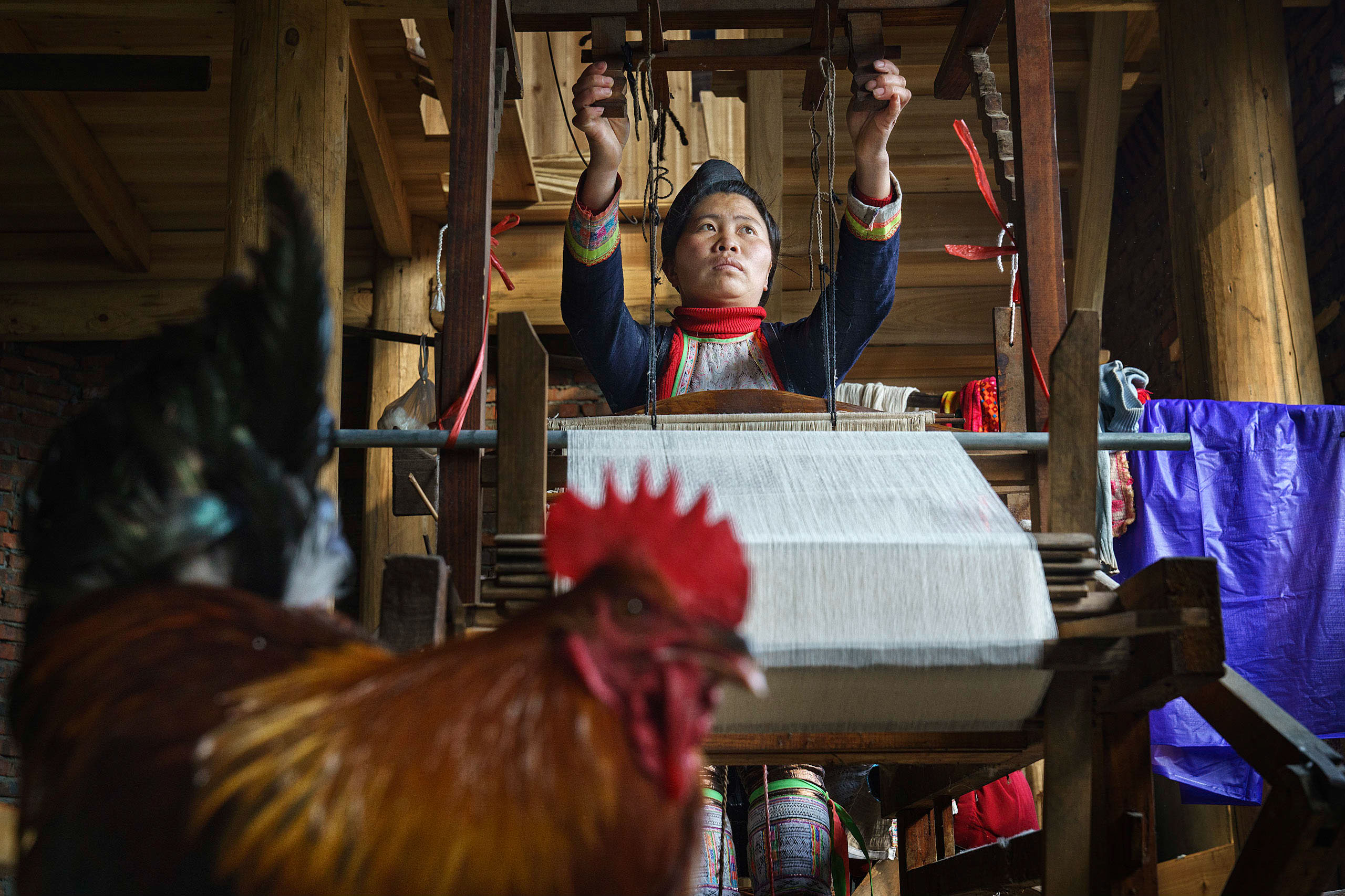 A woman from the ethnic Miao minority weaves fabrics using traditional methods. Her hand is black because of the indigo used in dyeing the material.