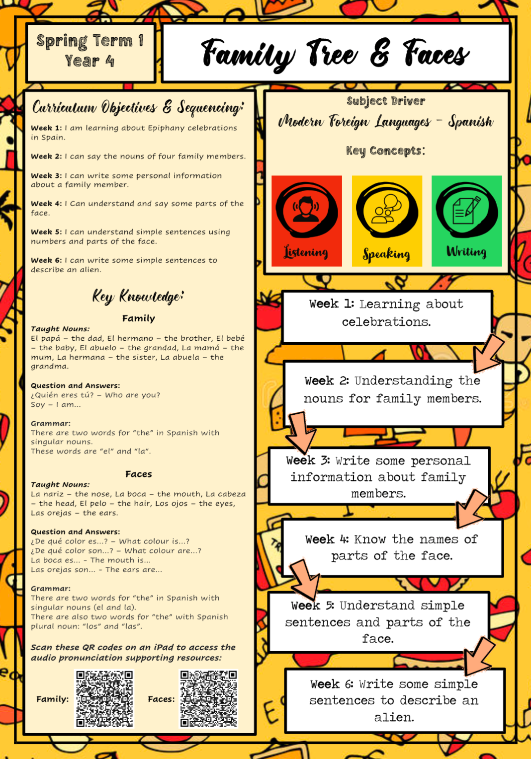 The intent of our Modern Foreign Languages (MFL) curriculum in Spanish is to provide a high-quality, engaging language education that lays the foundation for pupils to understand and respond to spoken and written language from authentic sources. Our curriculum is designed to develop confidence in speaking Spanish, with a strong emphasis on three key areas: phonics, vocabulary, and grammar. In phonics, we focus on blending sounds to form words and segmenting words into their component sounds, which aids in pronunciation and reading skills. For vocabulary development, we use a variety of authentic materials and contexts to expand pupils' word knowledge, enabling them to express ideas and opinions creatively. Grammar instruction includes understanding basic structures appropriate to Spanish, such as feminine and masculine forms, conjugation of high-frequency verbs and sentence construction.