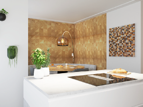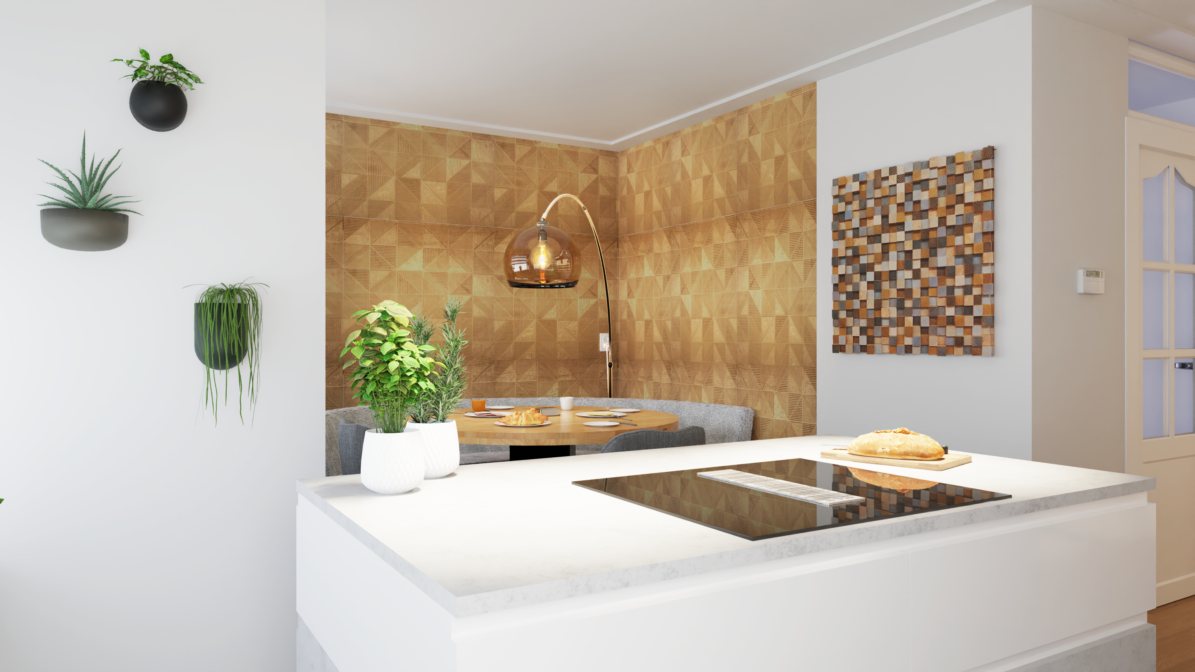 Als wanddecoratie in de eethoek, kies ik voor een 3D houten paneel van Wooden Wall Art.