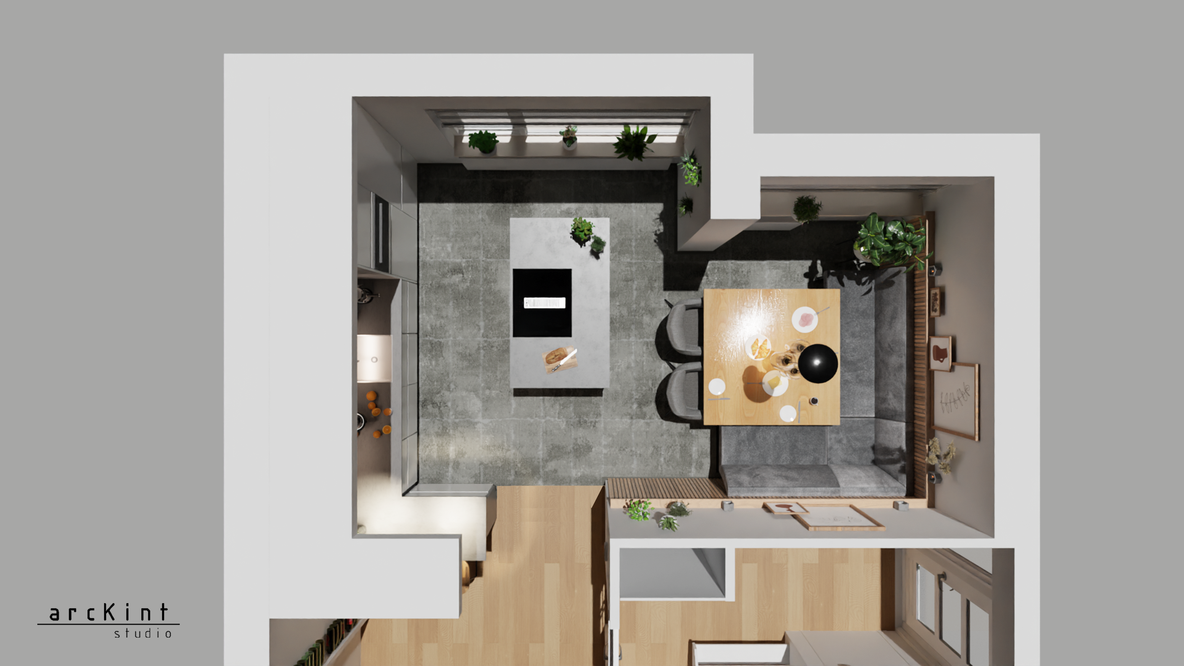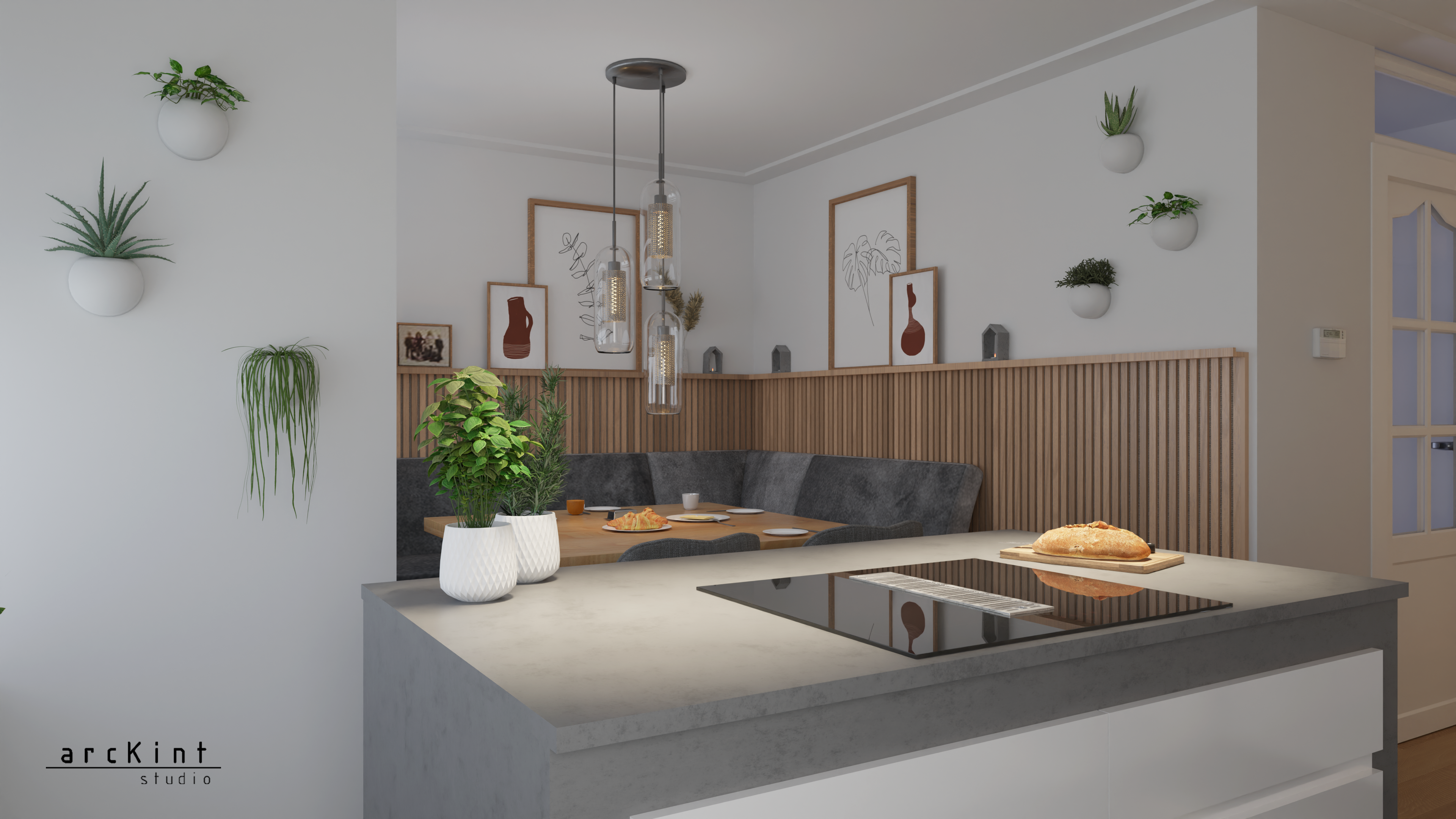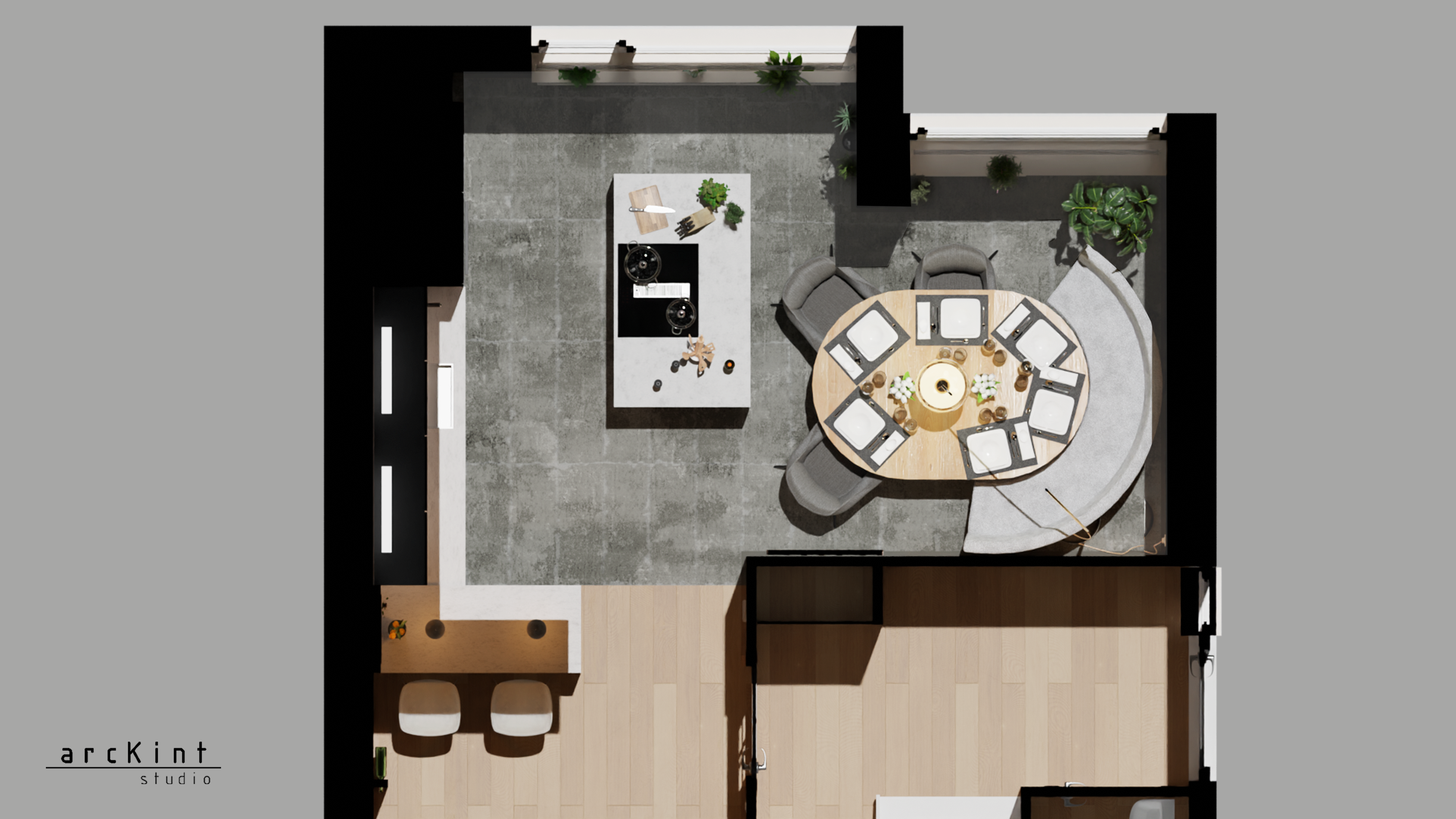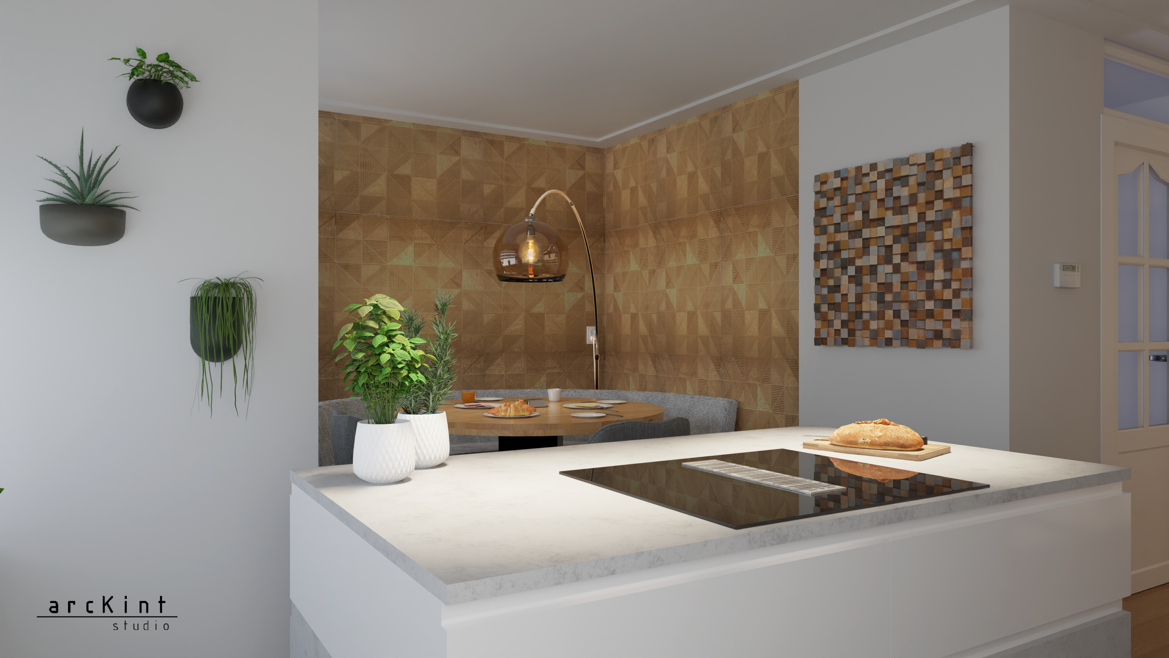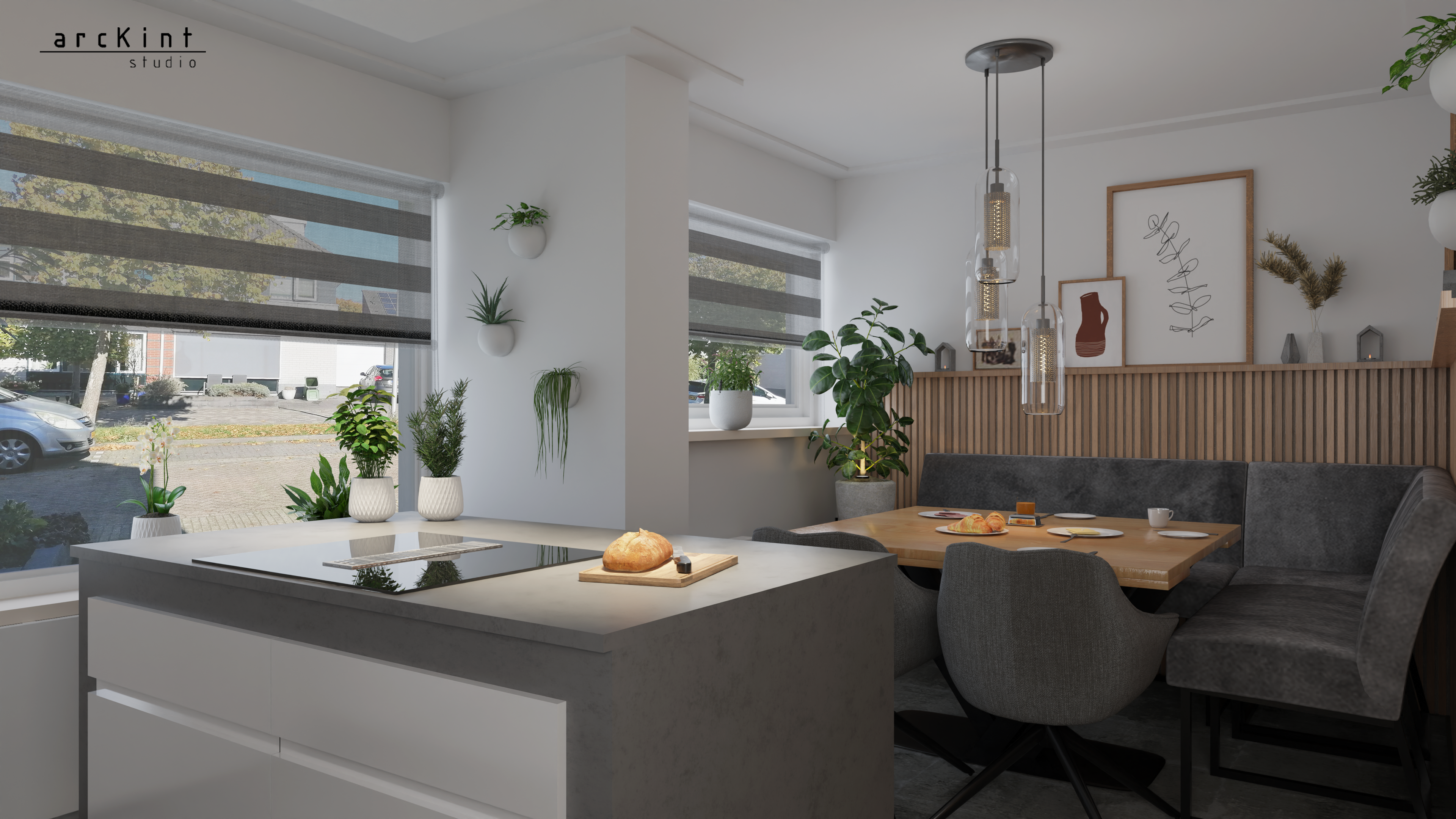 In de eerste optie, kies ik een ronde eettafel een ronde eetbank voor in de eethoek. Waar de eetkamer was komt een keukenkast wand met een barretje en een kookeiland.