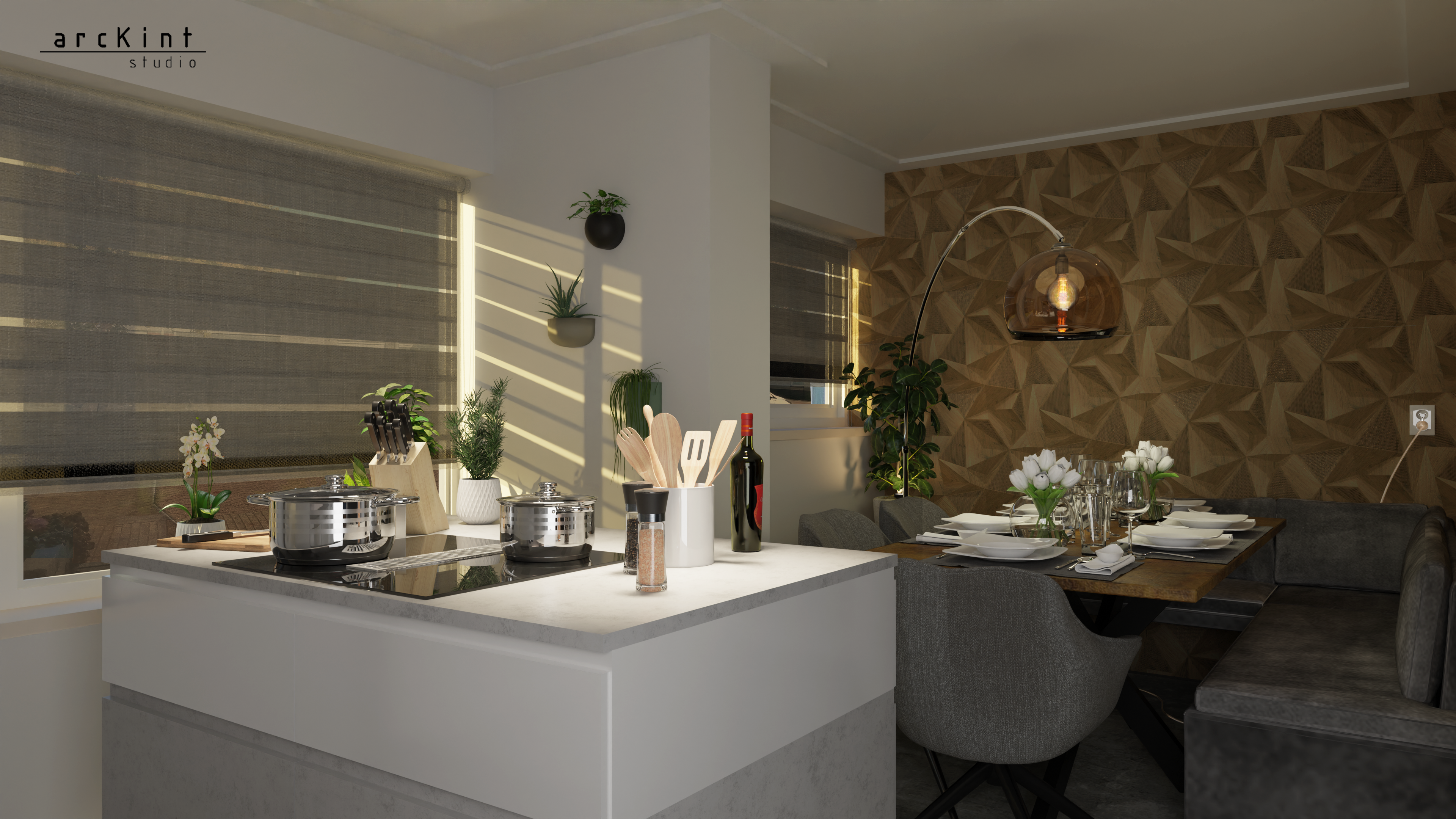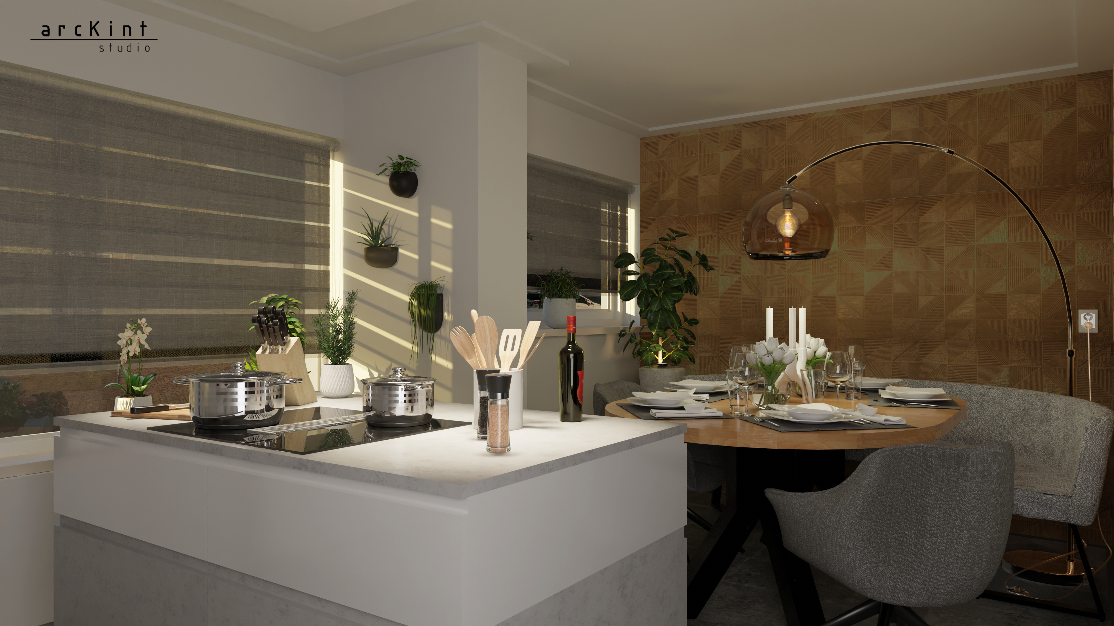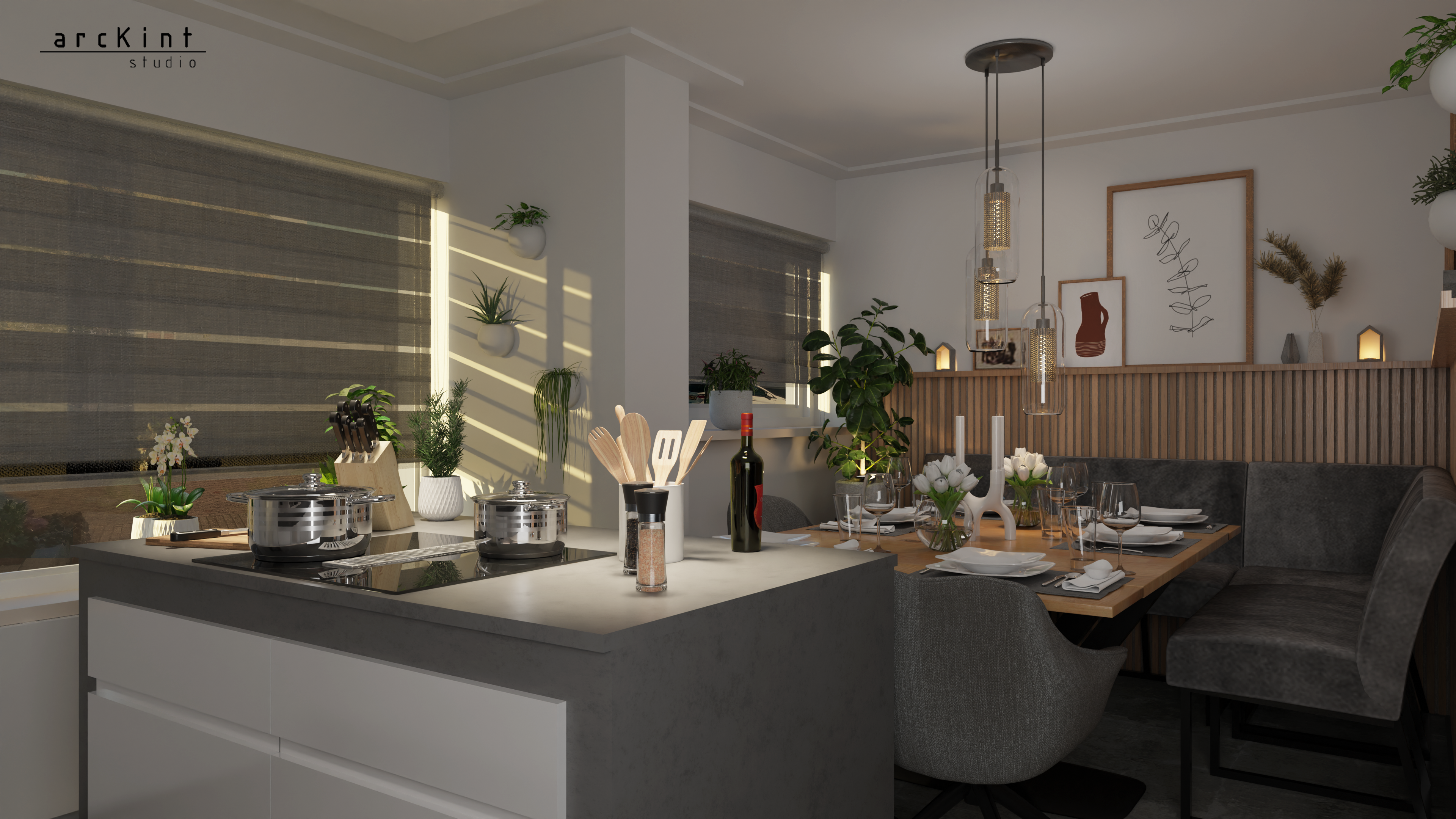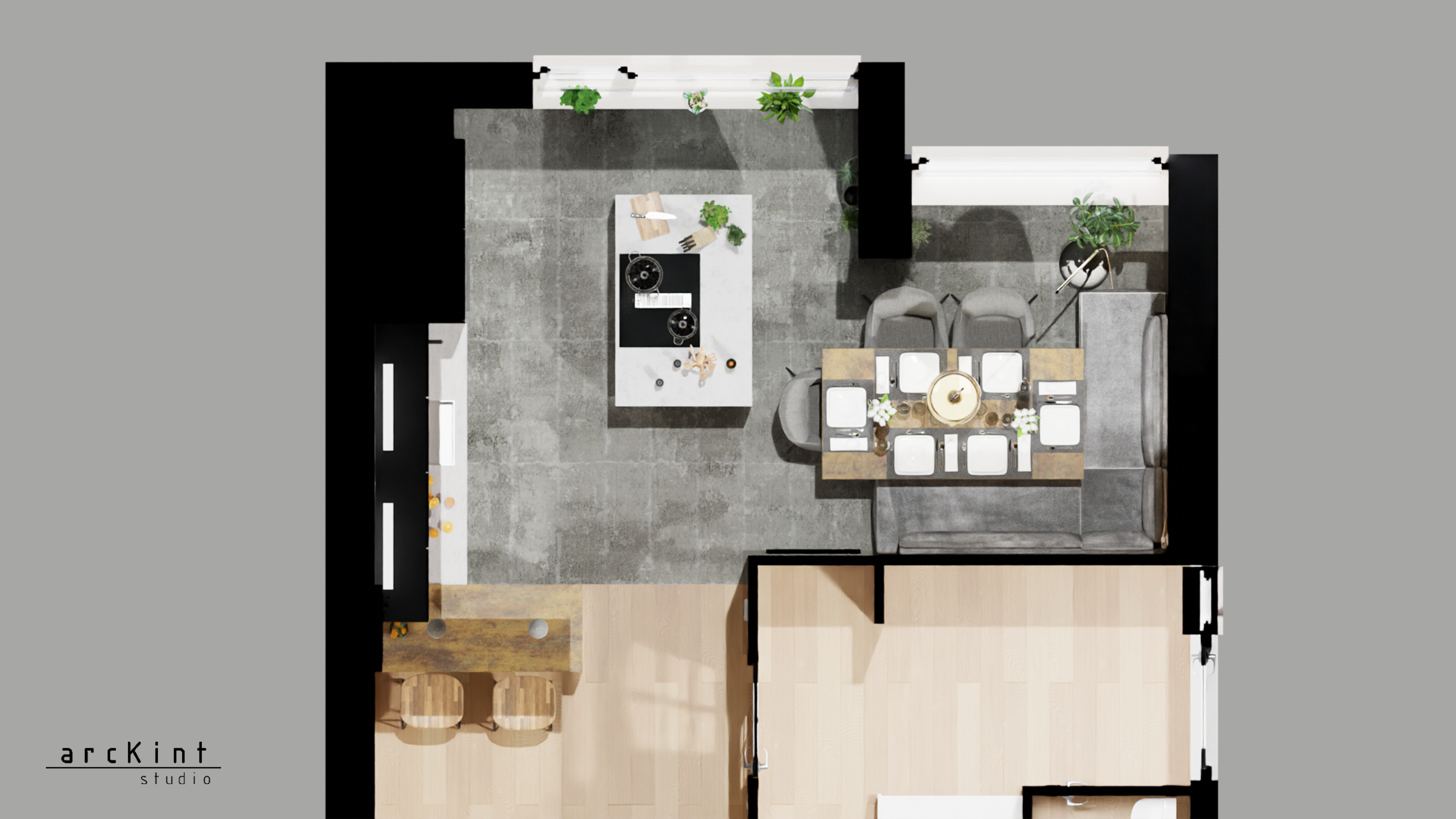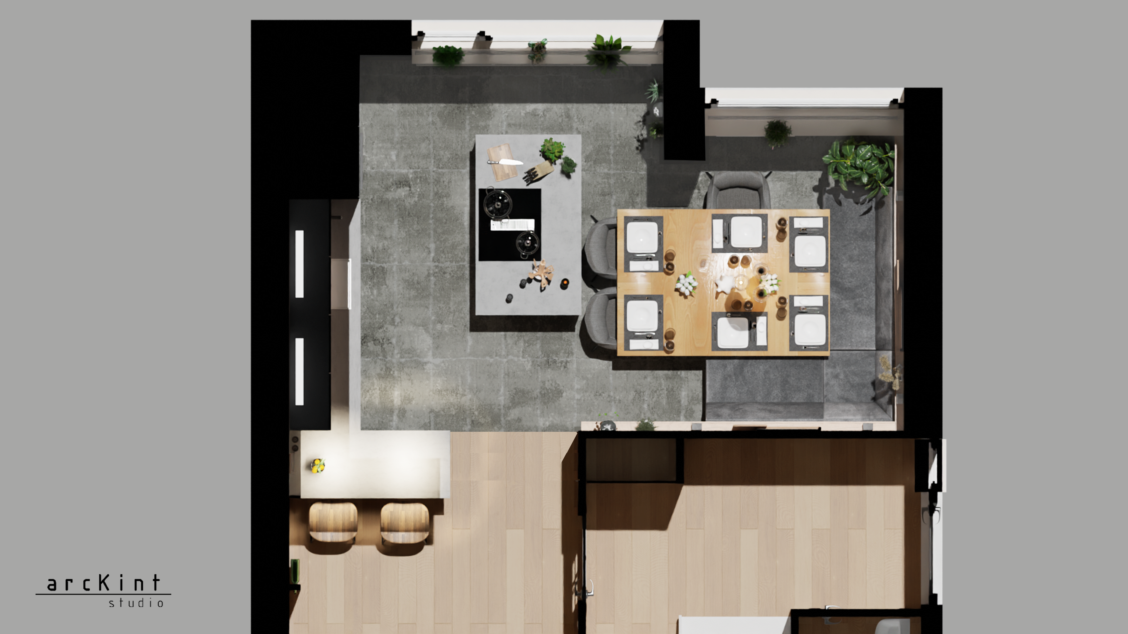 In de eerste optie, kies ik een ronde eettafel een ronde eetbank voor in de eethoek. Waar de eetkamer was komt een keukenkast wand met een barretje en een kookeiland.