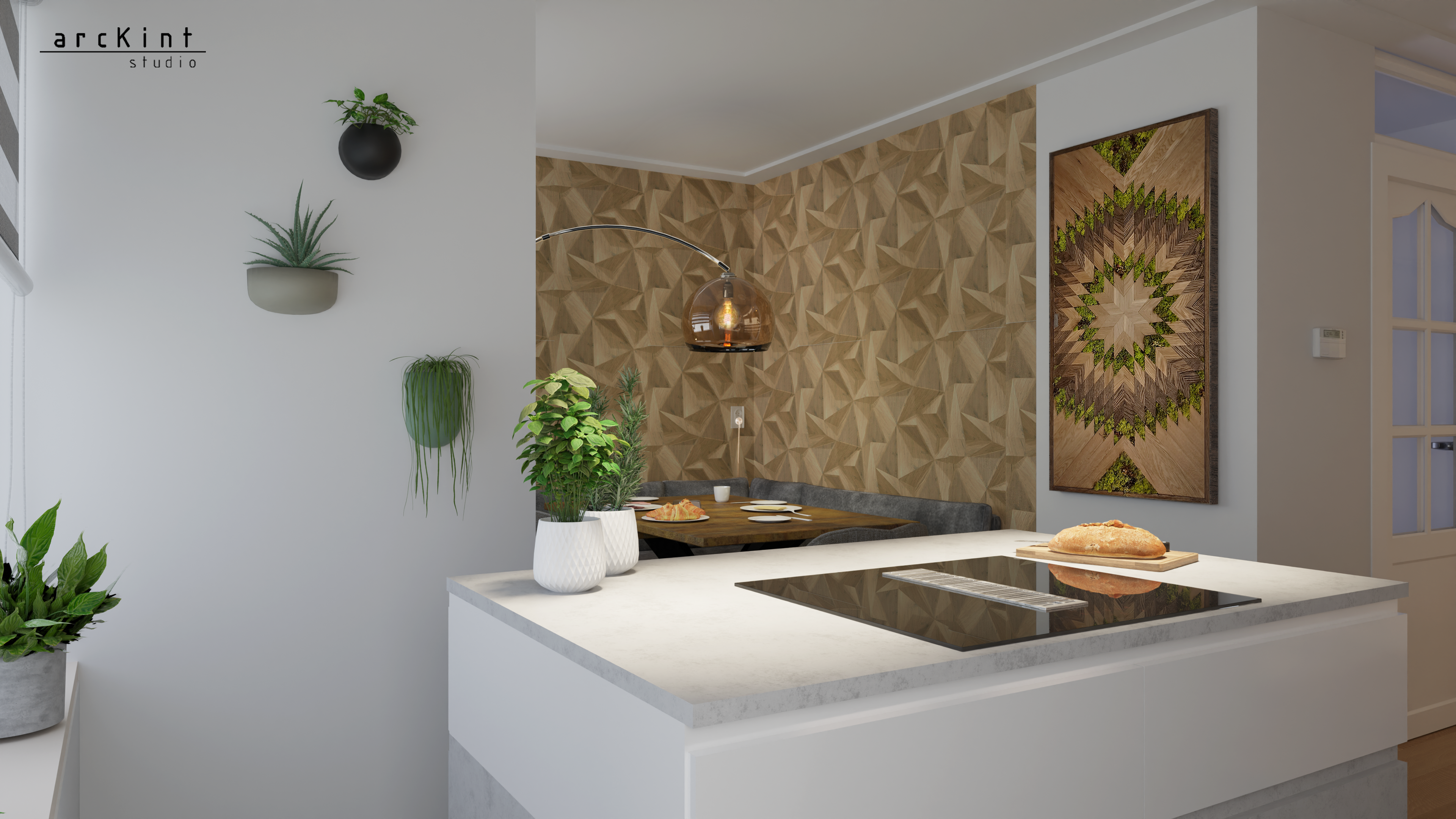 Na een paar dagen namen ze contact op met de vraag of ik eventueel een andere indeling met een rechthoeken tafel, een eethoekbank en een behang dat ze voor oog hadden, in beeld kon brengen.