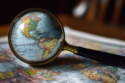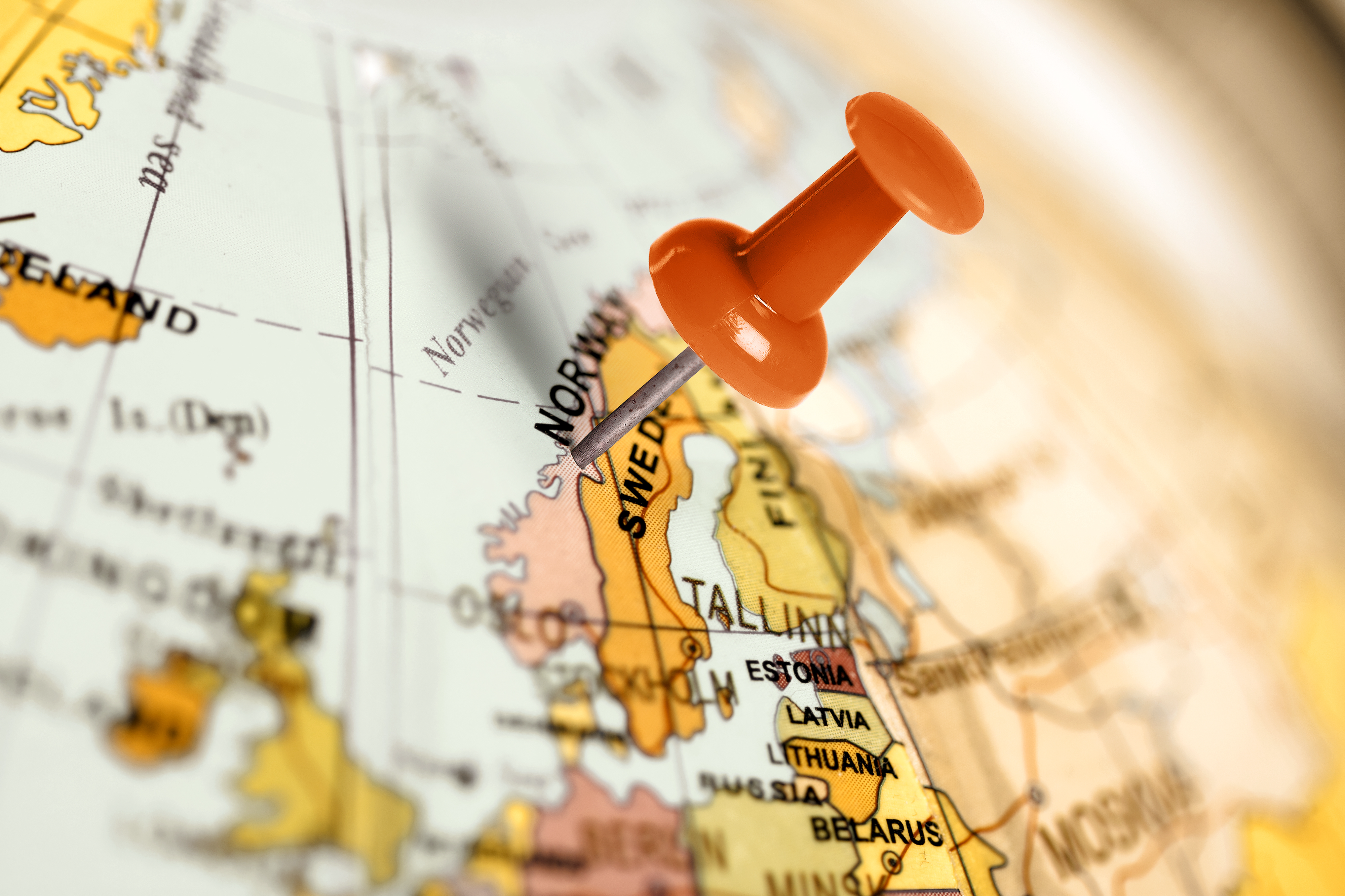 Created with images by Gatherina - "Magnifying glass showing planet earth on top of laptop keyboard" • Zerophoto - "Location Norway. Red pin on the map."