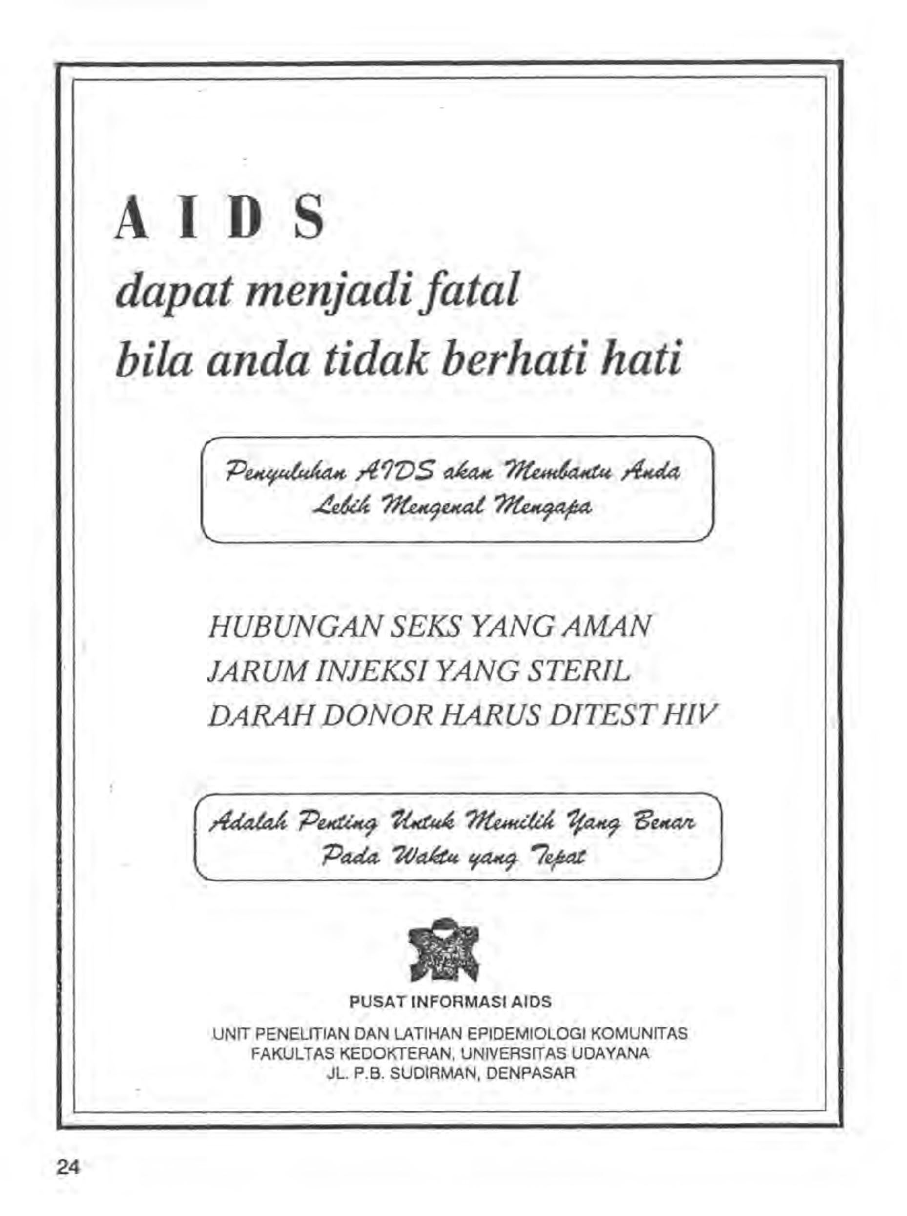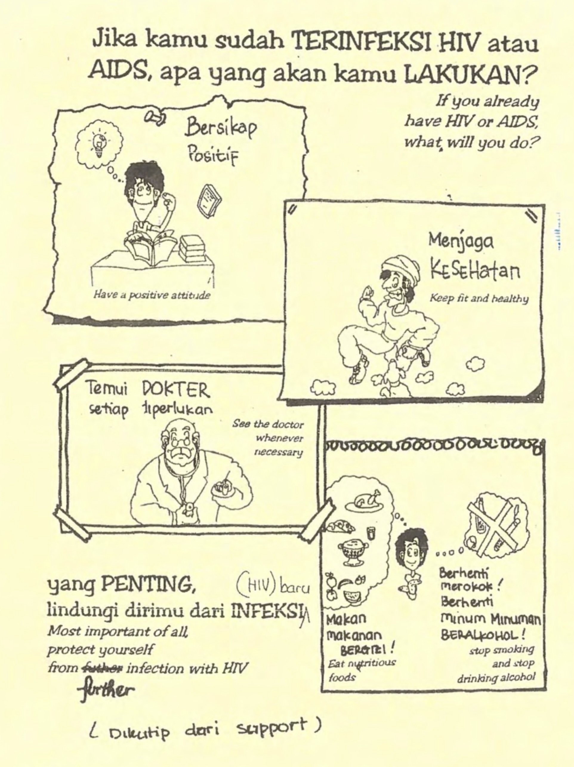 The brochure was adapted from materials made by the AIDS Committee Toronto (Canada), Victorian AIDS Council (Australia) and Gay Men Health’s Centre (US). Importantly the adaptation utilised informal language and bahasa cong (gay/waria language) to speak directly to the community. Unfortunately we have not yet been able to locate a copy of this important piece of Indonesian history - if you have a copy please let us know!