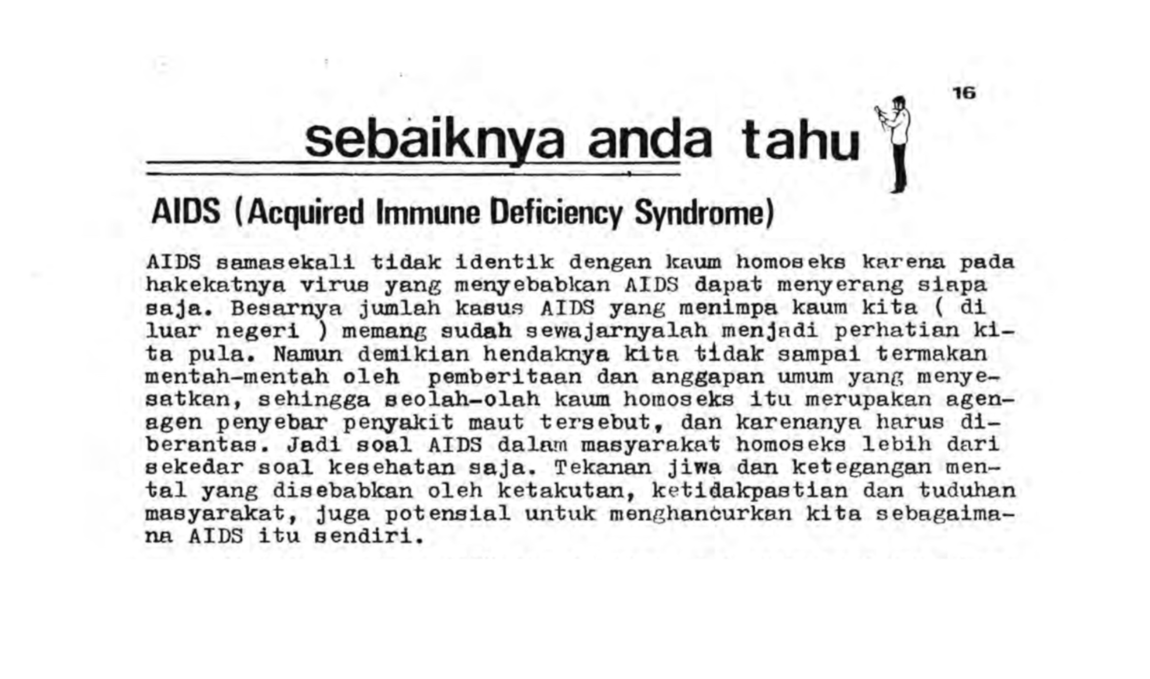 Created by the gay men’s group Persaudaraan Gay Yogyakarta (PGY), Jaka published its first edition in 1985. This first edition featured the article “Sebaiknya Anda Tahu” (For Your Information) an explainer on HIV/AIDS. The article acknowledges the growing fears within the community in response to the spread of homophobic AIDS messaging in the media.