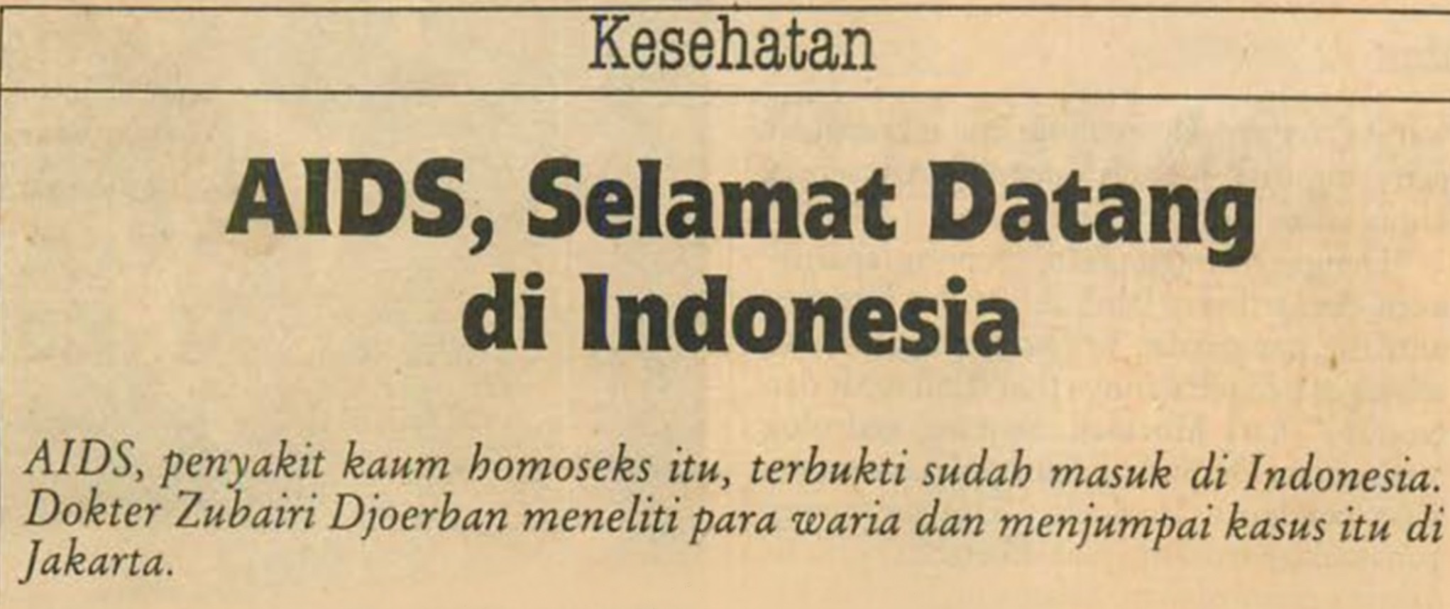 This Tempo Magazine article 'AIDS, Welcome to Indonesia' published on 29th October 1983, marks some of the first mainstream press coverage of HIV in Indonesia. Referring to AIDS as a homosexual disease, the article chronicles the first HIV research conducted in Indonesia by Dr. Zubairi Djoerban.