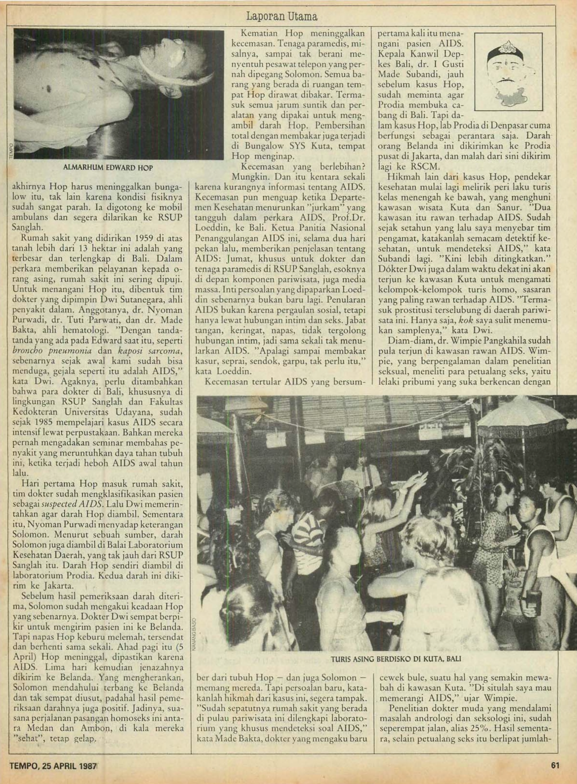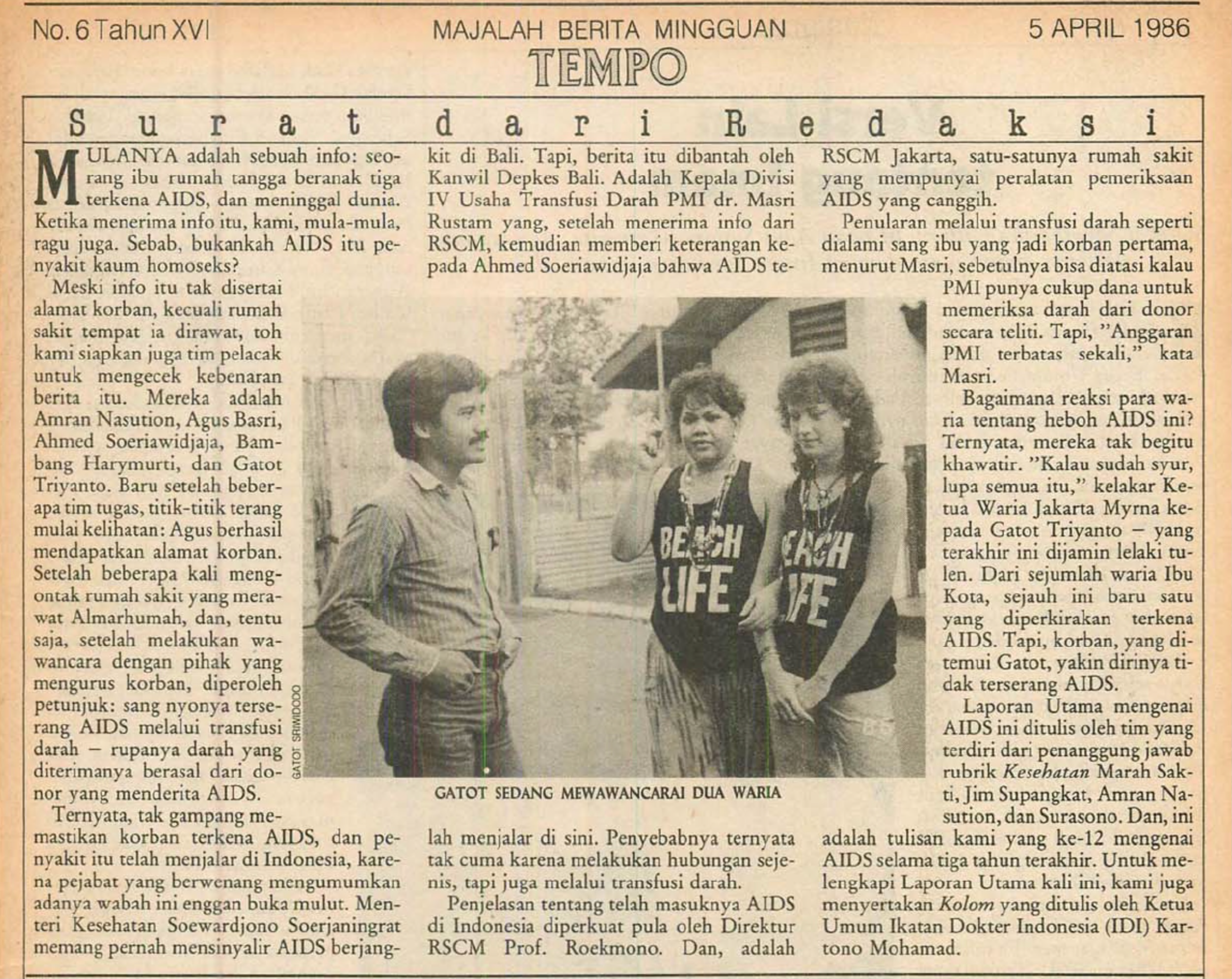 In the above article Tempo reports on what is possibly the first HIV related death in Indonesia - the death of a 25-year-old woman who had contracted HIV from blood transfusions due to her haemophilia. However, contrary to media reporting on HIV in relation to gay and waria communities, the case was underplayed and the death was never formally confirmed as HIV related by the Indonesian Health Department.