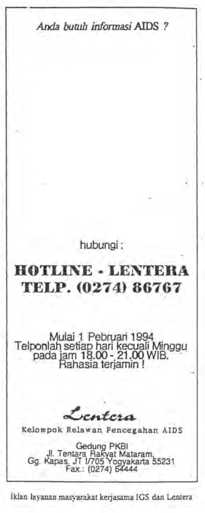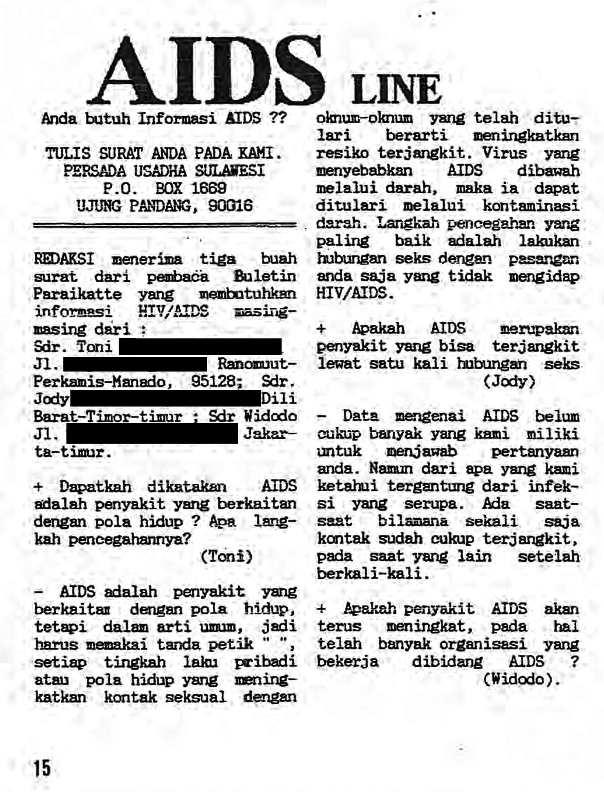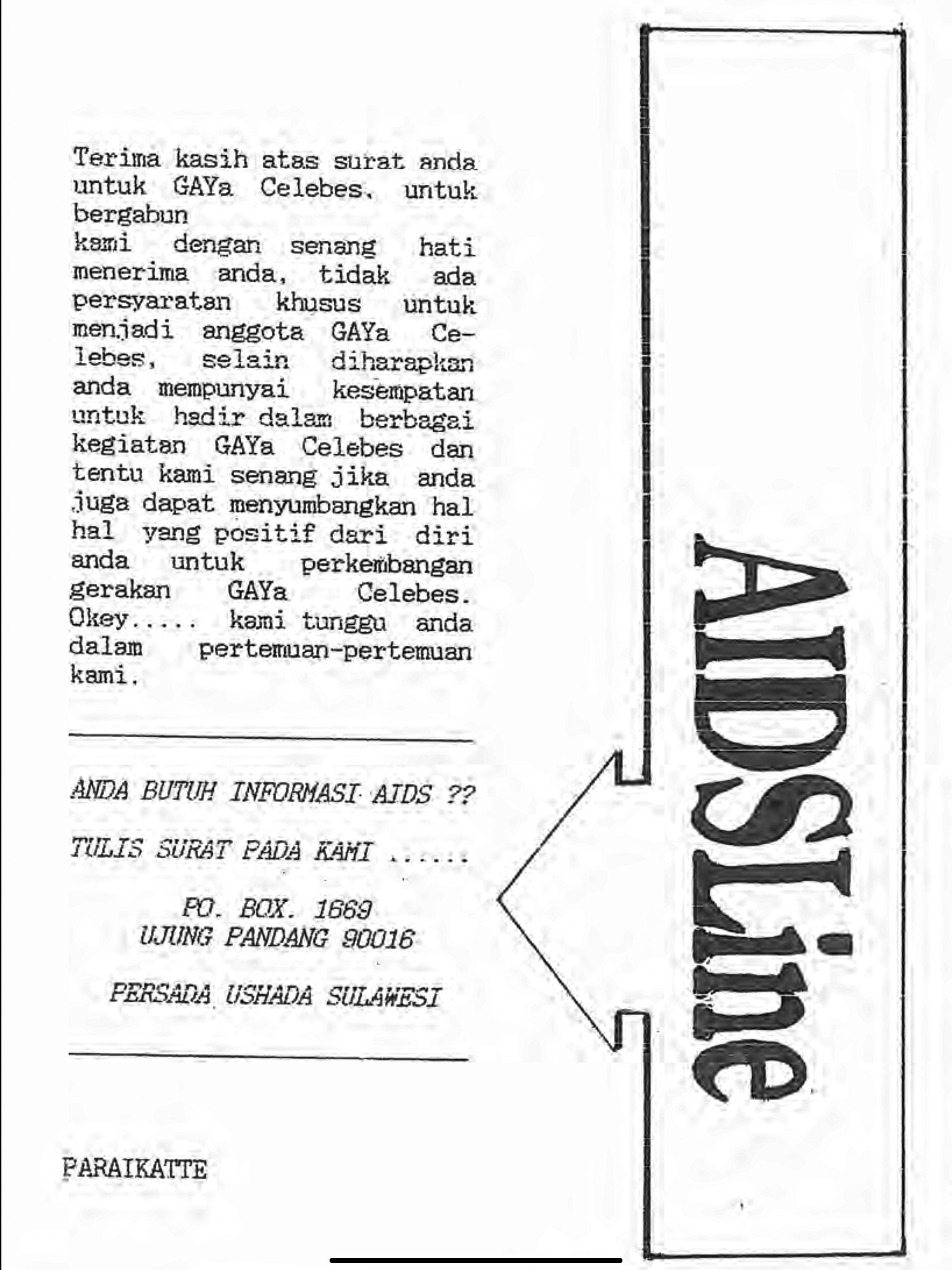 Paraikatte, a Makassar based magazine first published in 1994, created a letters based HIV hotline called ‘AIDS Line’. This section allowed readers to send in any questions or comments they have about HIV and sexual health with the newly formed GAYa Celebes responding to the communities questions and concerns.