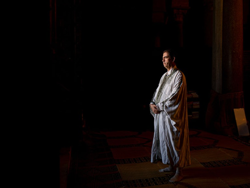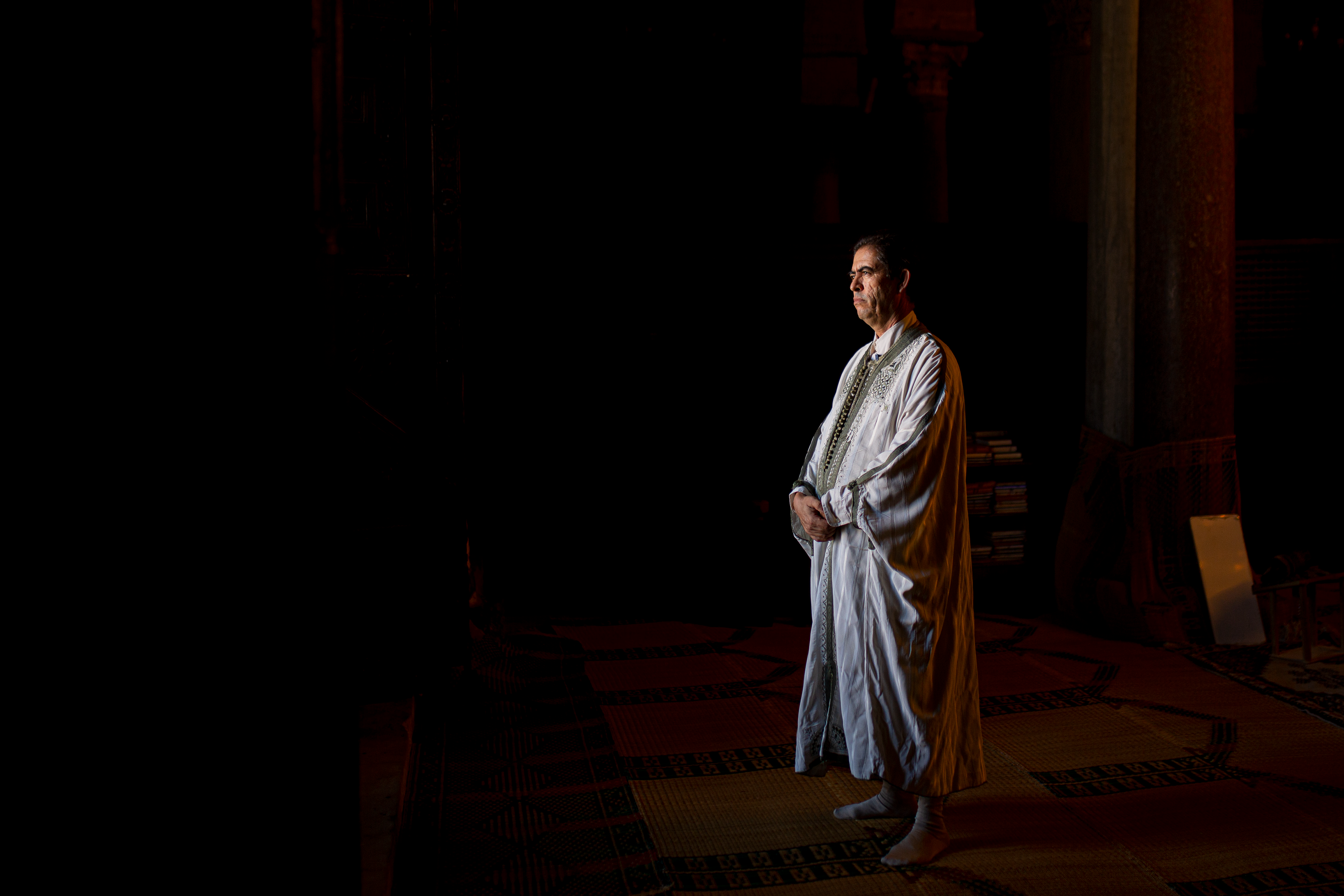 Ahmed Zahani, an Imam, prays inside Zitouna mosque. He talks about his experience tacking radicalization: “When I encounter young men pursued by violent extremism, I sit down with them and give them a sound religious foundation to counter dangerous ideas.”