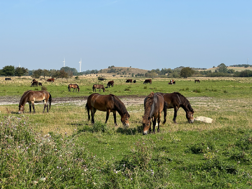 Am Ende des Waldweges versperrt ein Gatter den Weg. Noch einmal um die Ecke biegen – und da sind sie: die wilden Pferde von Langeland. Braune Exmoor-Ponys grasen auf der Feuchtwiese, manche stehen mitten im Wasser, trinken oder rupfen Schilf. Die Fohlen folgen ihren Müttern Tritt auf Tritt. Ein Wildpferd wälzt sich im nassen Gras, zwei andere knabbern sich gegenseitig die Mähnen, betreiben Fellpflege.
