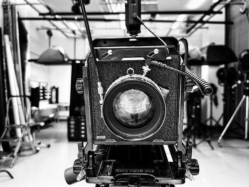Working in another large open studio space the students got a chance to work with a large format analogue Toyo camera. This traditional approach is very precise and requires great effort and skill to set up and execute correctly. The camera was connected to two large flash lights which were used to illuminate the sitter's head.