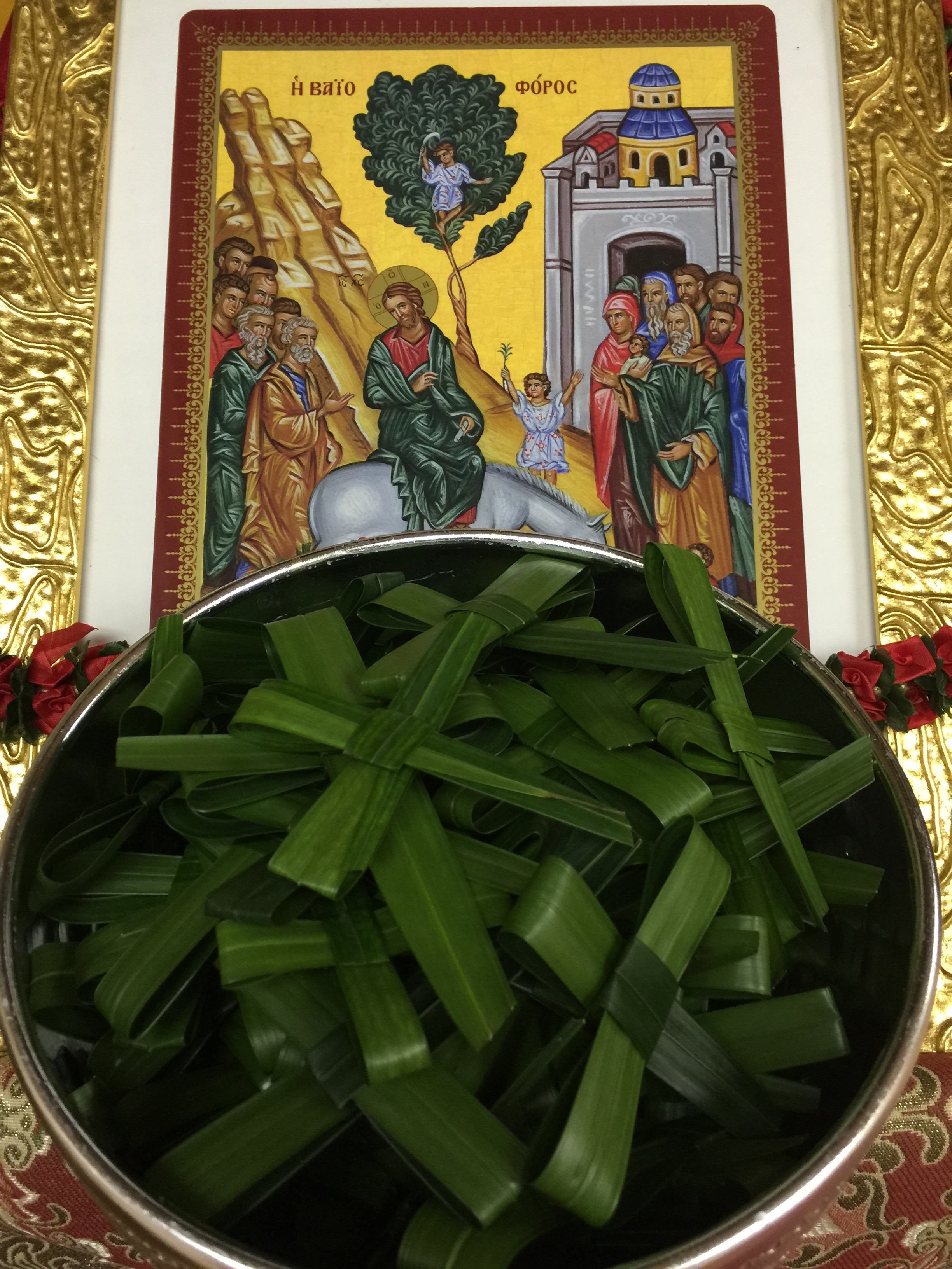 Palm Sunday celebrates the glorious and brilliant feast of the Entrance of Jesus into Jerusalem (John 12:1-18). Zechariah had prophesied the entrance of the Messiah into Jerusalem, saying: “Rejoice greatly … O daughter of Jerusalem; behold, the King comes unto Thee; he is just, and having salvation; lowly, and riding upon an ass, and upon a colt the foal of an ass”, Zech. 9:9. The contemporary Jews associated this prophecy with the expected Messiah. This action of Christ testifies to His nature as Messiah, but with the definite declaration that His Kingdom was not of this world. The main road leading to Jerusalem was covered with palm trees. The multitudes, with palm branches in their hands, spread their cloaks on the road as a show of respect, crying out “Hosanna to the Son of David. Blessed is He that comes in the name of the Lord.” A custom of distributing branches of palms to the people in the Church prevails to this day.