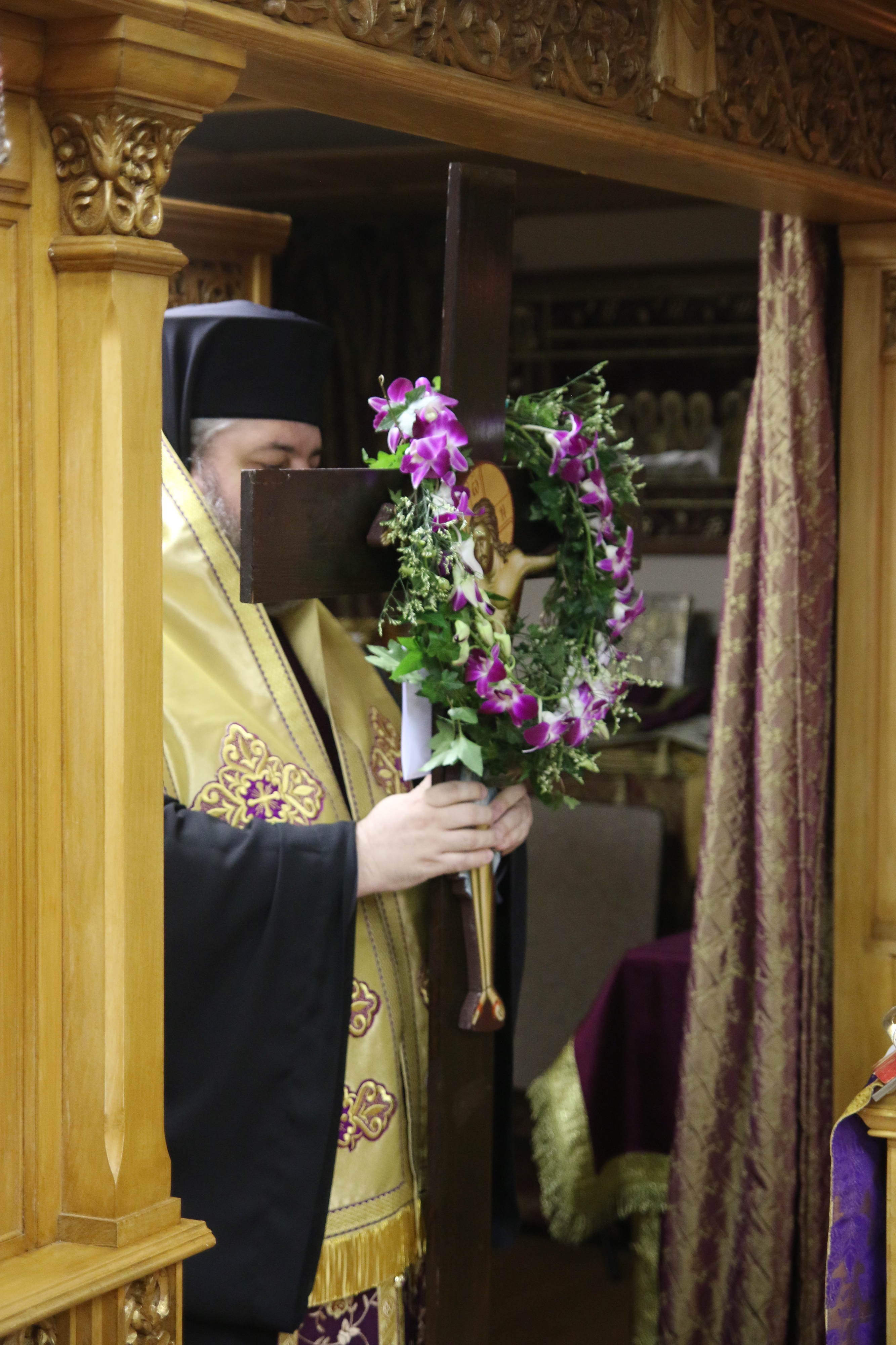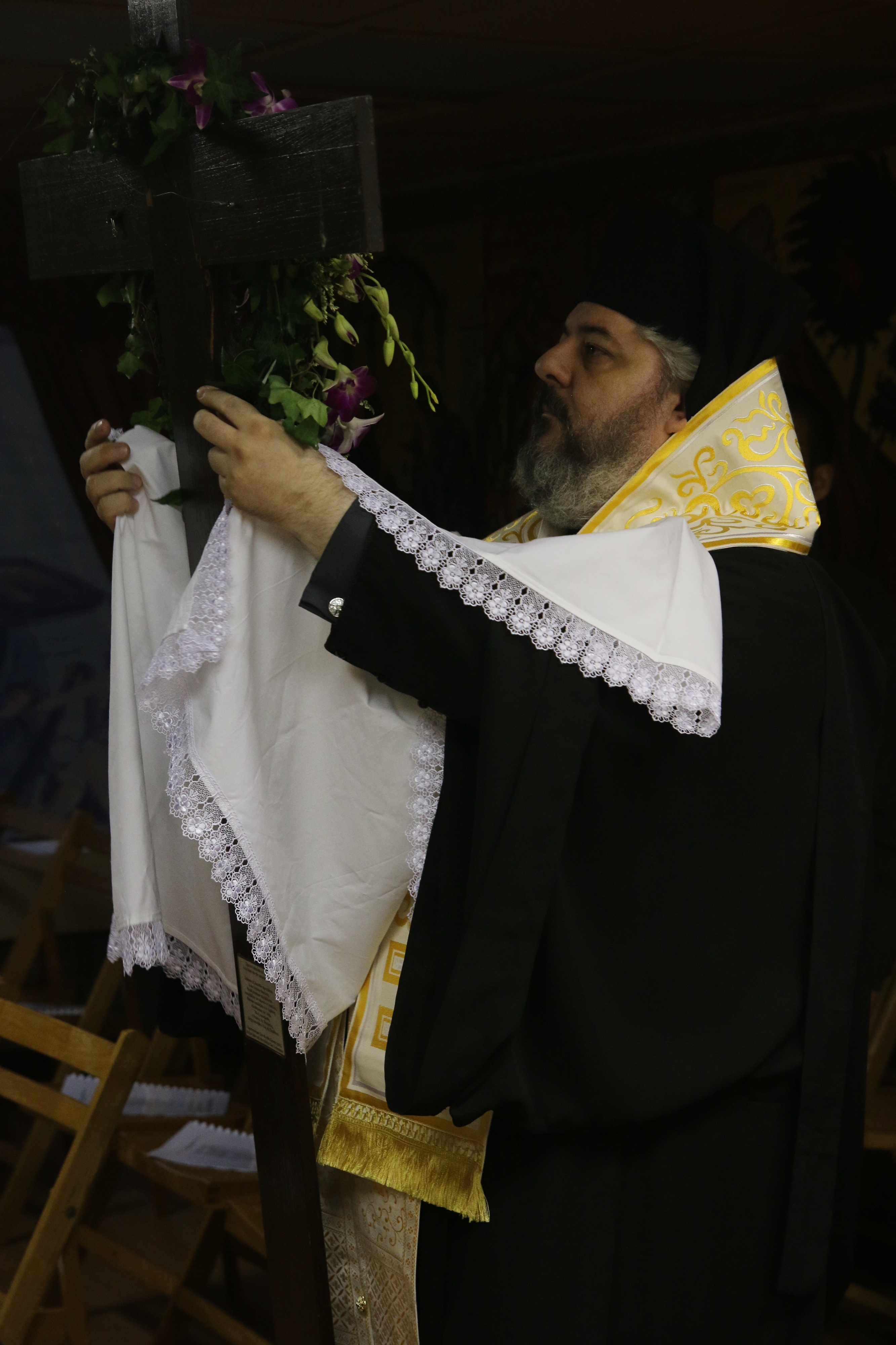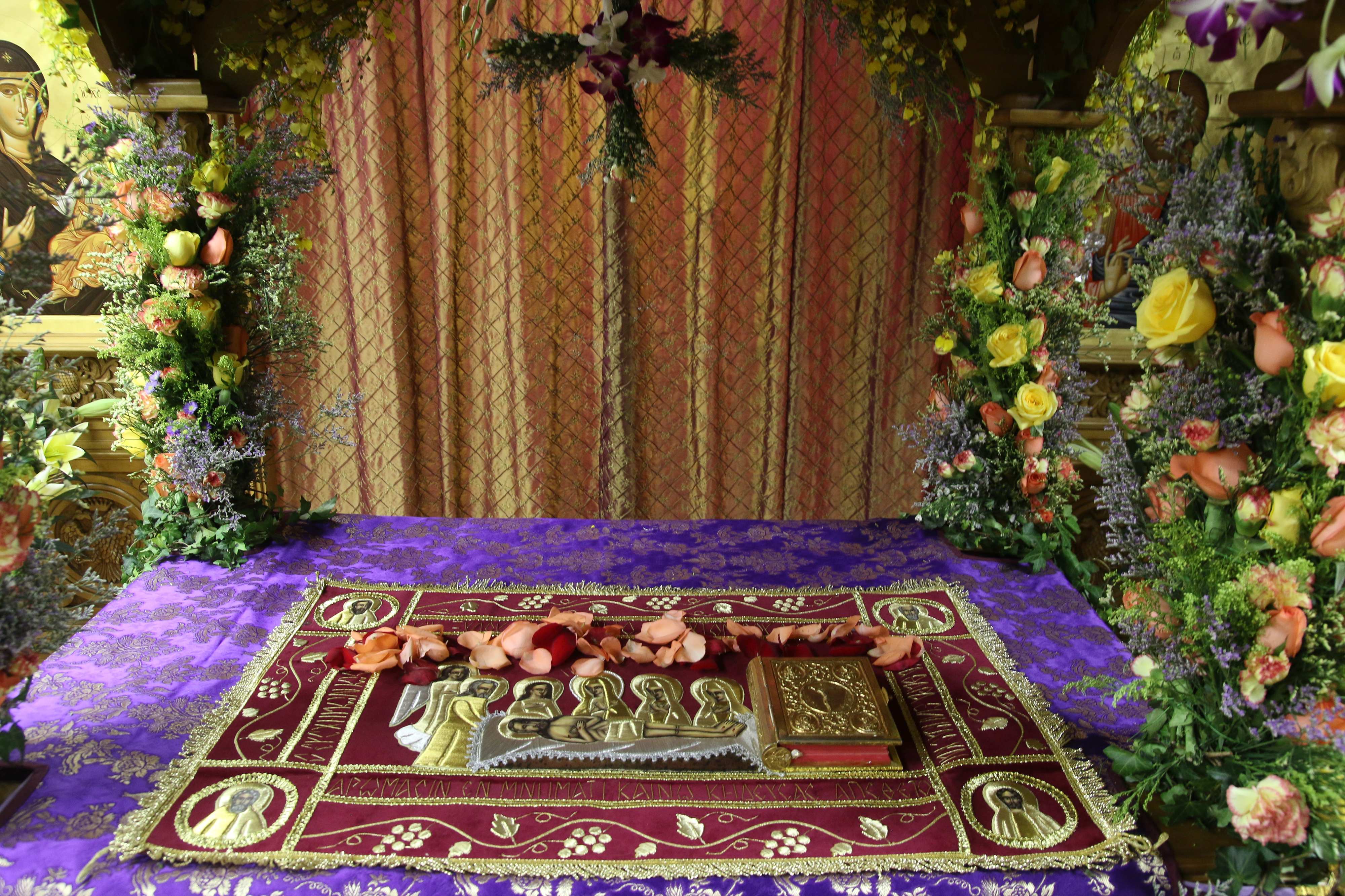 At one point in the reading, the Body of Christ is removed the cross, wrapped in a white cloth and is brought into the sanctuary. Following the reading, the priest carries the icon of the Epitaphios through the church and places it in the Sephulchre (the kouvouklion), which has been decorated with flowers.