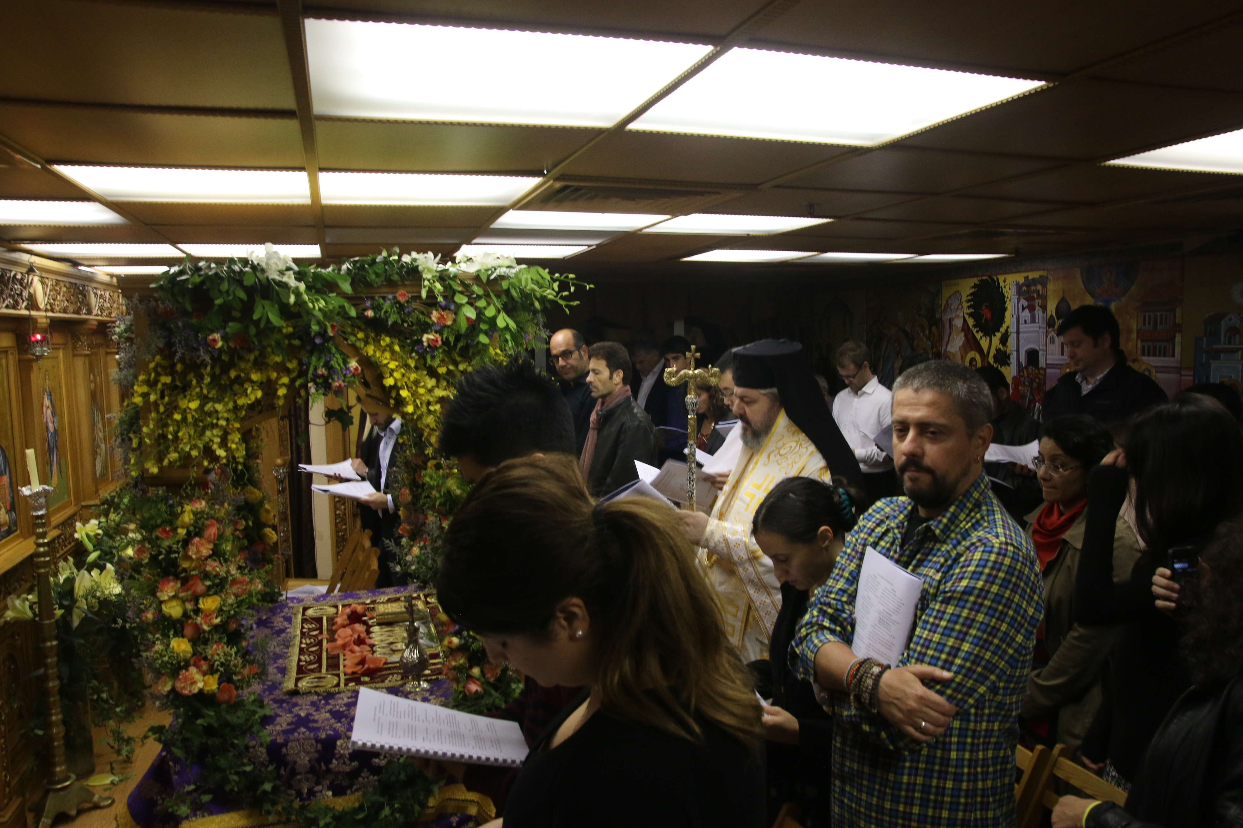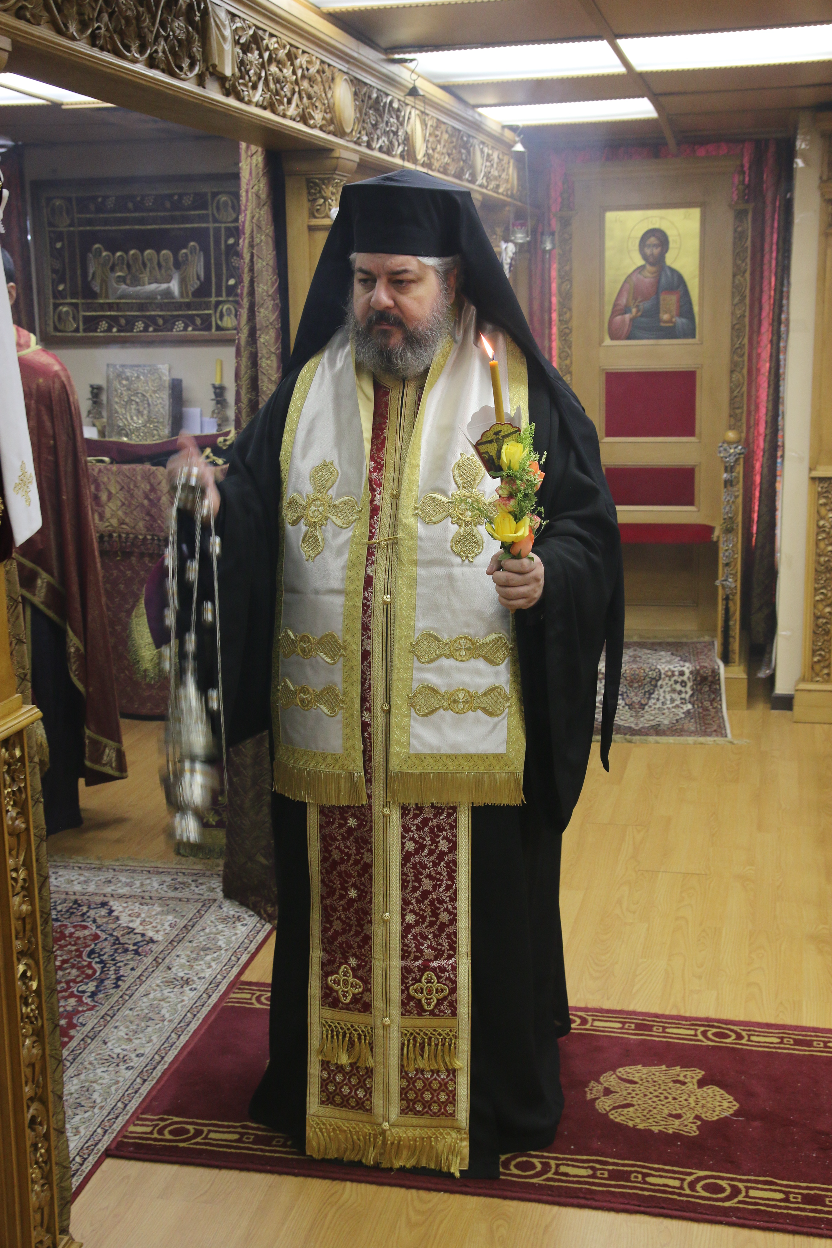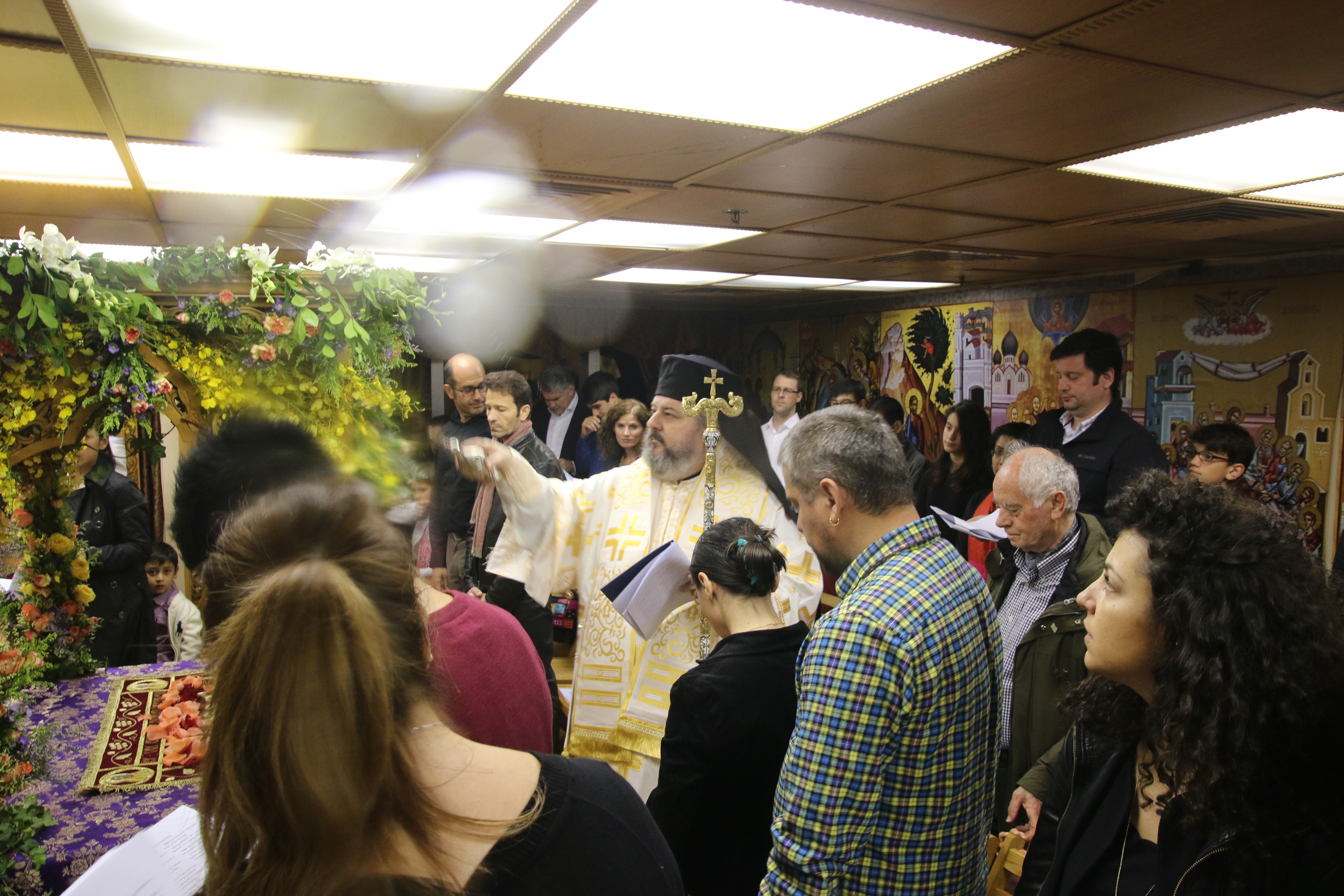 At one point in the reading, the Body of Christ is removed the cross, wrapped in a white cloth and is brought into the sanctuary. Following the reading, the priest carries the icon of the Epitaphios through the church and places it in the Sephulchre (the kouvouklion), which has been decorated with flowers.