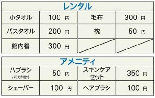 尚、以下はレンタル・アメニティ料金表となります。
