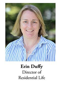 Dorm Parents: Have questions about your student’s adjustment in the dorm? Please reach out to their dorm parent. If you have general questions about Residential Life, please reach out to Erin Duffy, Taft’s director of residential life.