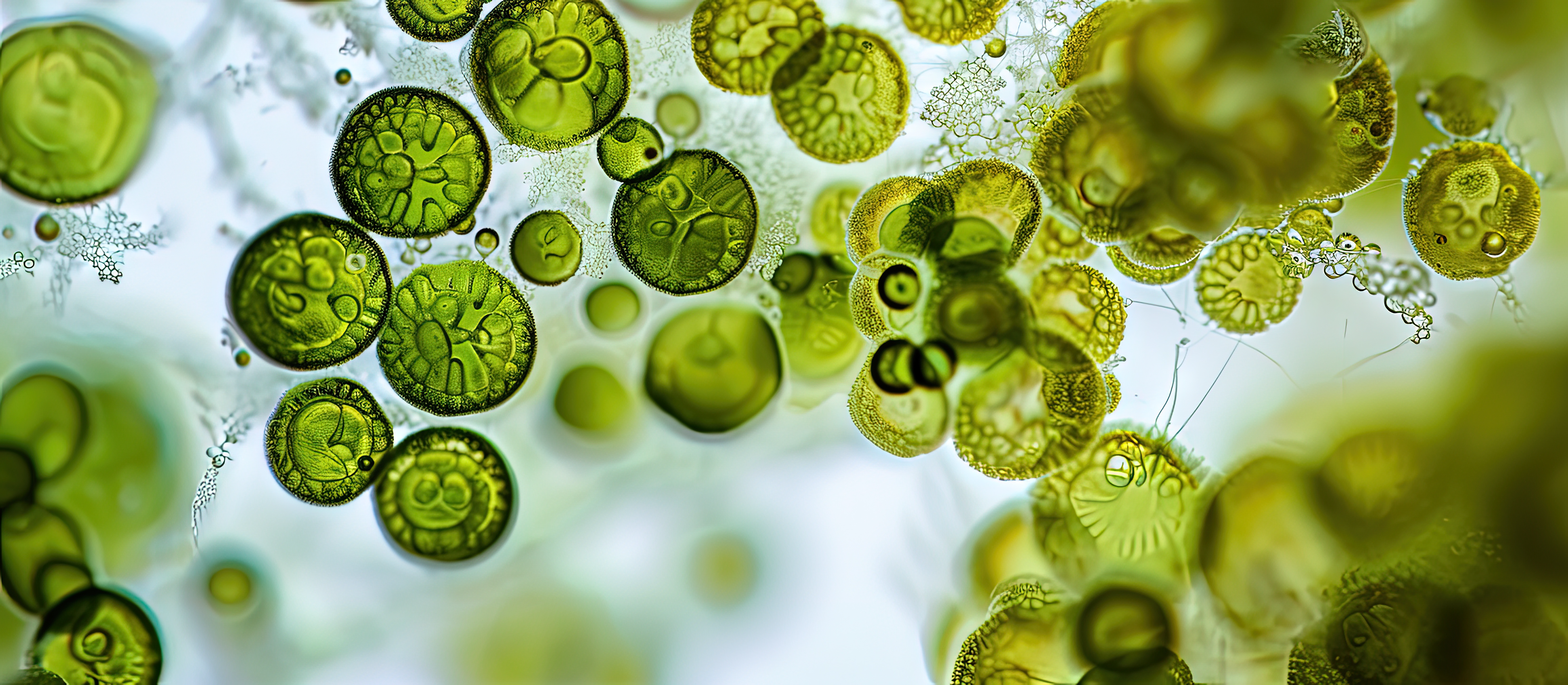 Criado com uma imagem de HN Works - "Micrasterias a genus of beautiful green algae from desmid group The species probably Micrasterias apiculata 100x magnification with selective focus. Creative Banner. Copyspace image"