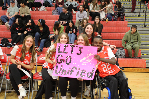 [Left to Right] Freshman Grace Gallagher, Freshman Amelia Vanthof, Freshman Chloe Shumaker, Freshman Olivia Leonardis, and Freshman Josiah Wallace pose for a picture with an encouraging sign. They are all a part of the Unified team and support the wildcats daily!