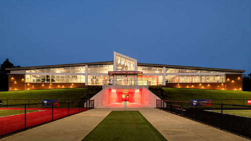 The student population and the public can enjoy the light-filled, celebratory reception area, featuring a Hall of Fame wall and a spectator area overlooking the athletic fields. A school-branded tunnel leads from the locker rooms to the competition fields, featuring a statue of the school mascot. The center supports the school’s culture with experiential graphics and school branding, an important design driver throughout the building.