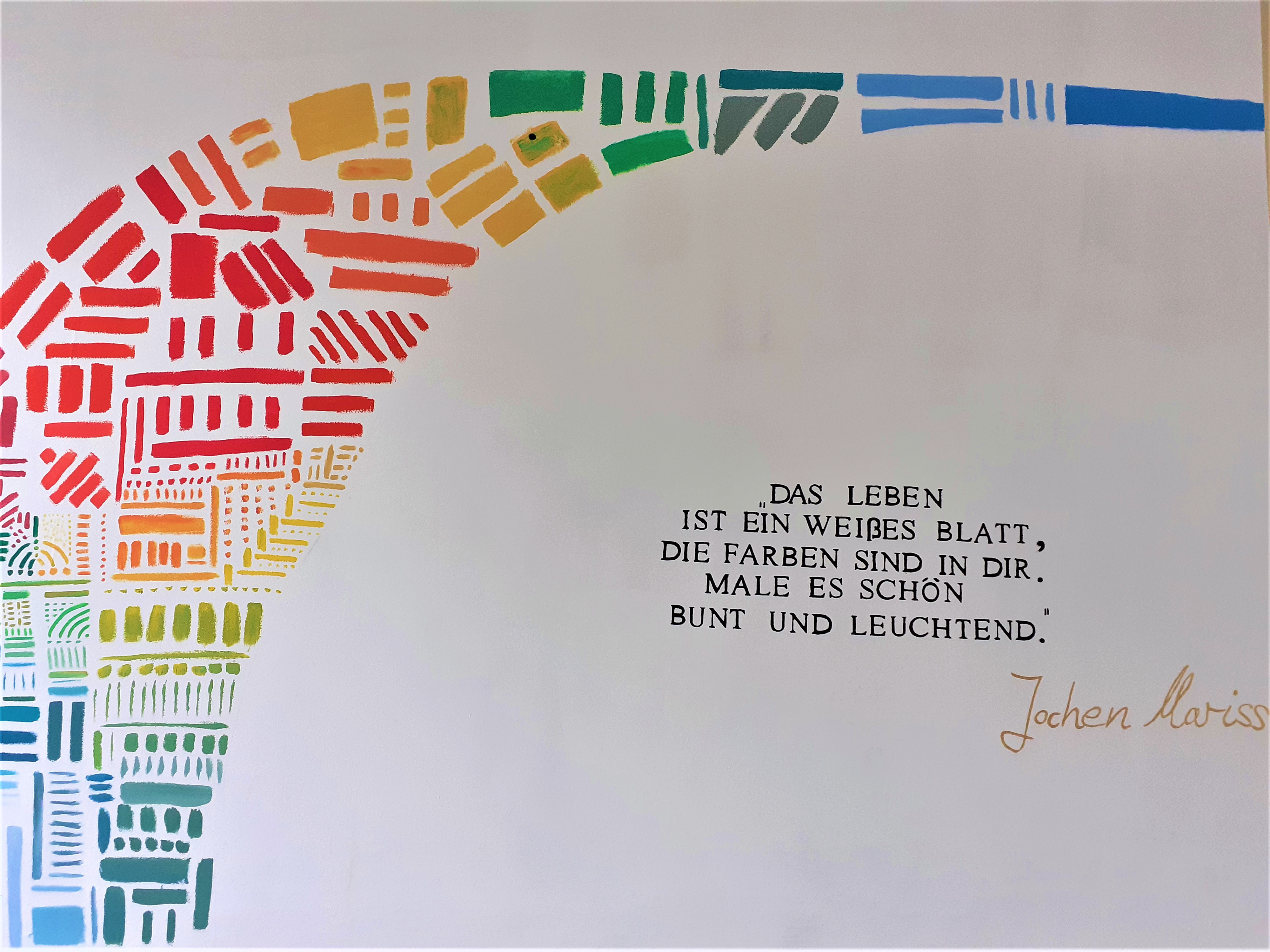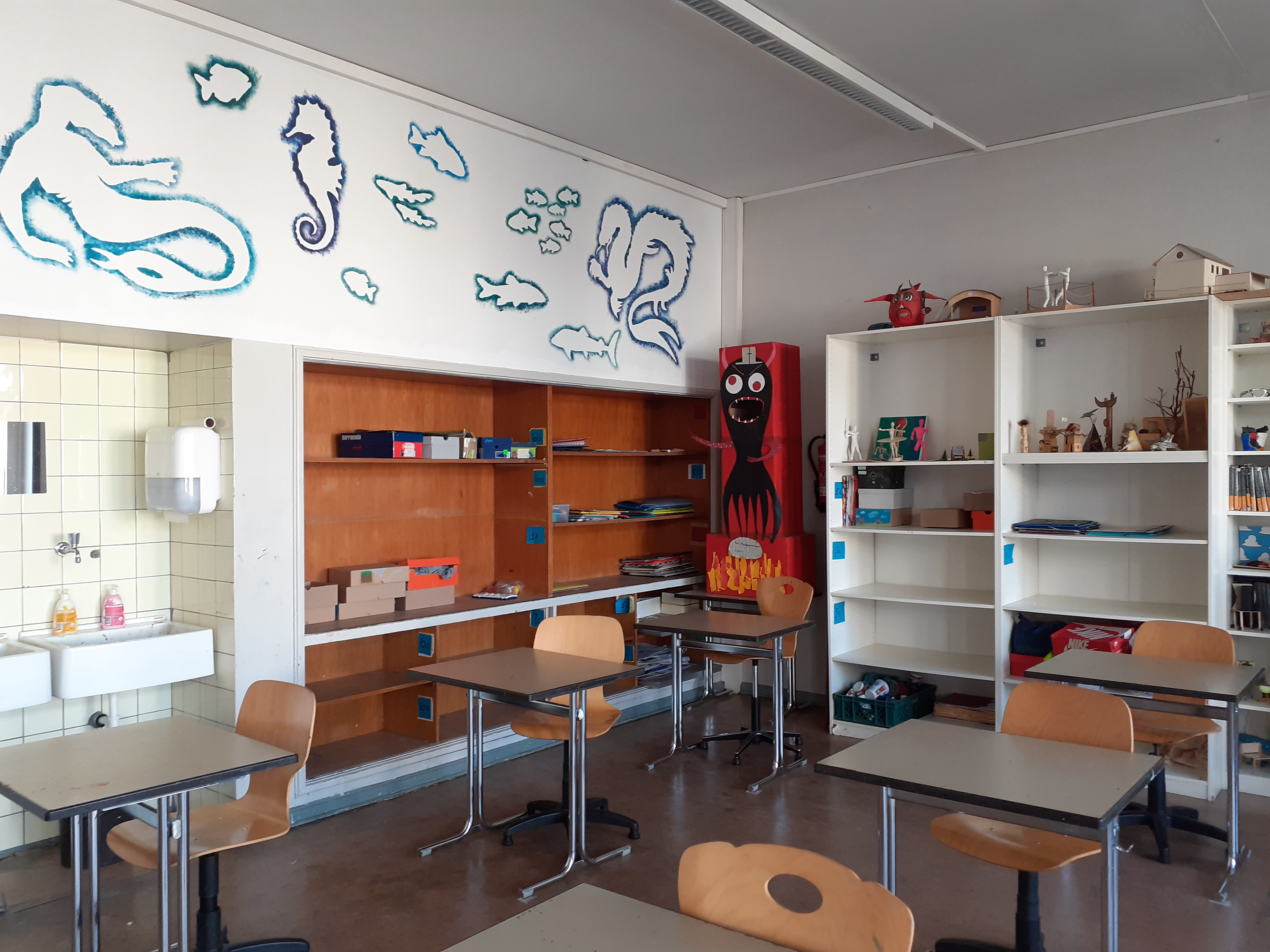 Lass uns wieder zurück ins Hauptgebäude gehen. Links und rechts kannst du unsere Schaukästen bewundern. Überall in unserem Schulhaus entdeckt man unsere Kunstwerke. Wir haben ein großes Interesse, unser Schulhaus selbst zu gestalten.