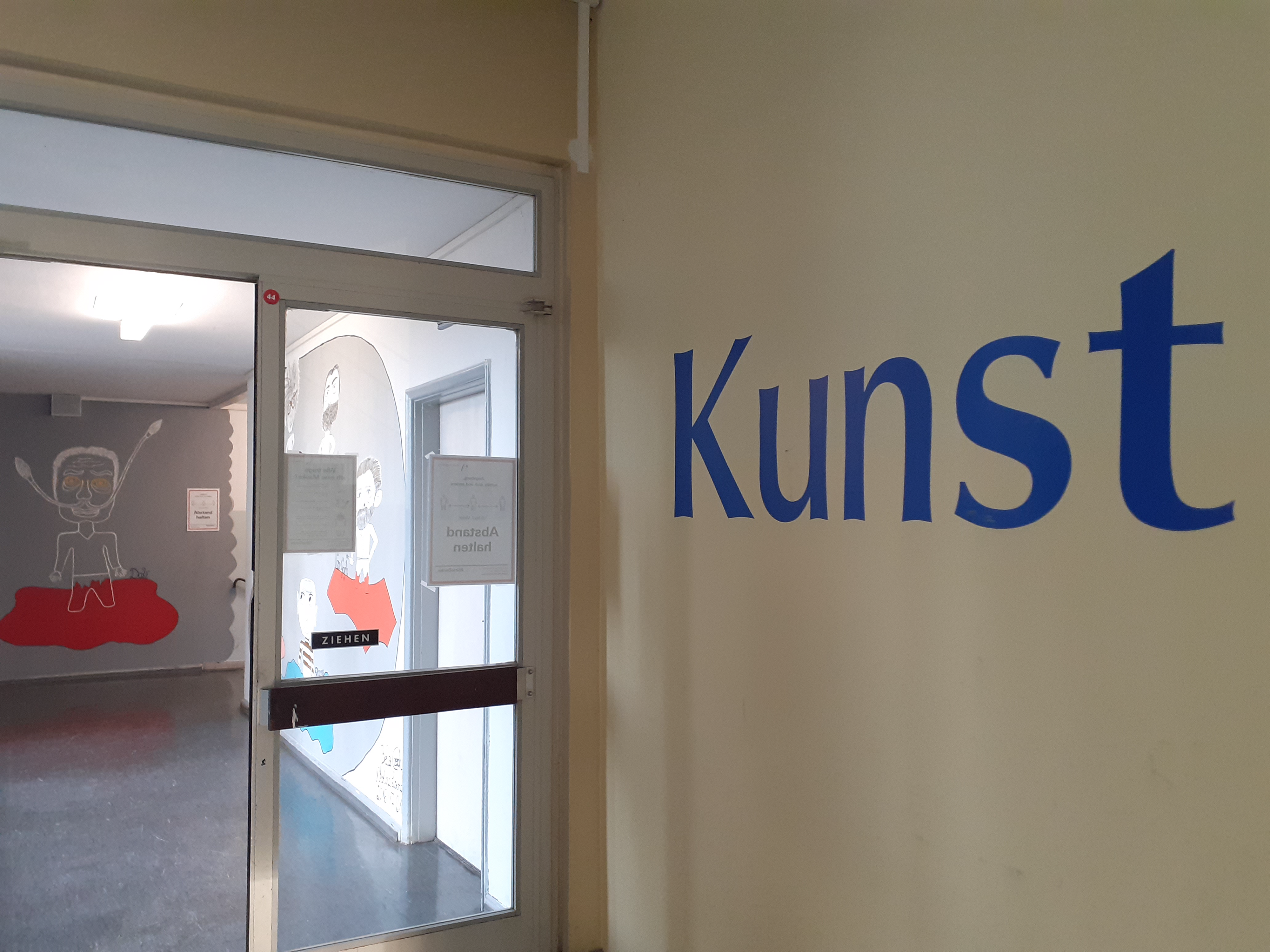 Lass uns weitergehen in Richtung Aula! Schau mal, auf dem Weg kommen wir am SMV-Zimmer vorbei, lass uns mal einen Blick hinein werfen.