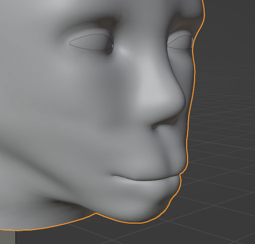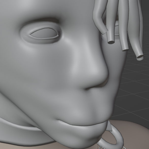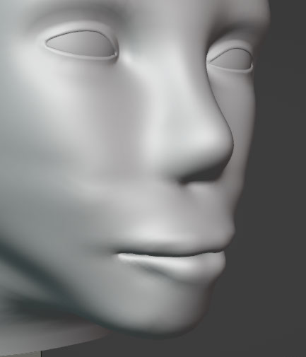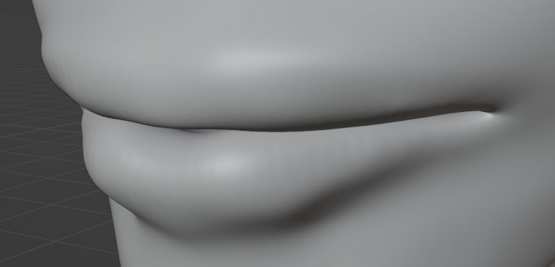 Much like in the prior sculpt, I used blender's multiresolution tool to tinker with the face shape. The lips suffered from having such a significant cleft, which made the face look more animalistic than human (the wrong kind of anthro). The newer lips have a stronger contrast between skin and lip-muscle.