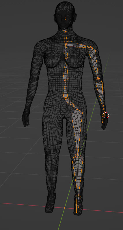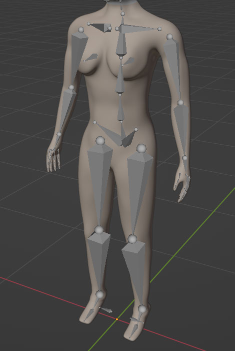 I also made an effort to place the bones into a place that would be identical to a real person. Because the spine is way at the back of the body, so too is my armature (as Blender calls it). I may consider inserting an extra bone in the chest of my character since I predict I will have muscle group issues with the breasts.