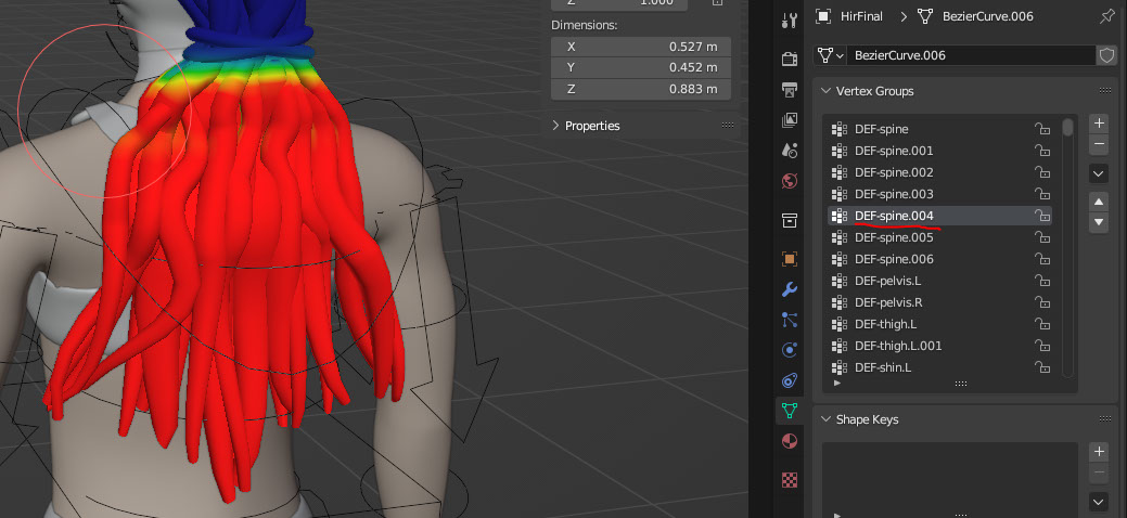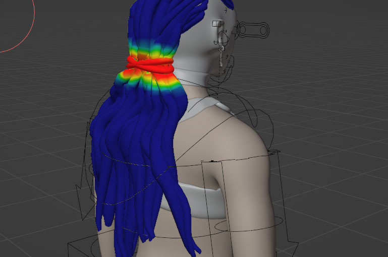 The rig could not correctly apply weights to the hair of my Kelpie, so I did this part automatically. Following the spinal structure, I apply muscles to the hair based on where it would lay on her back.