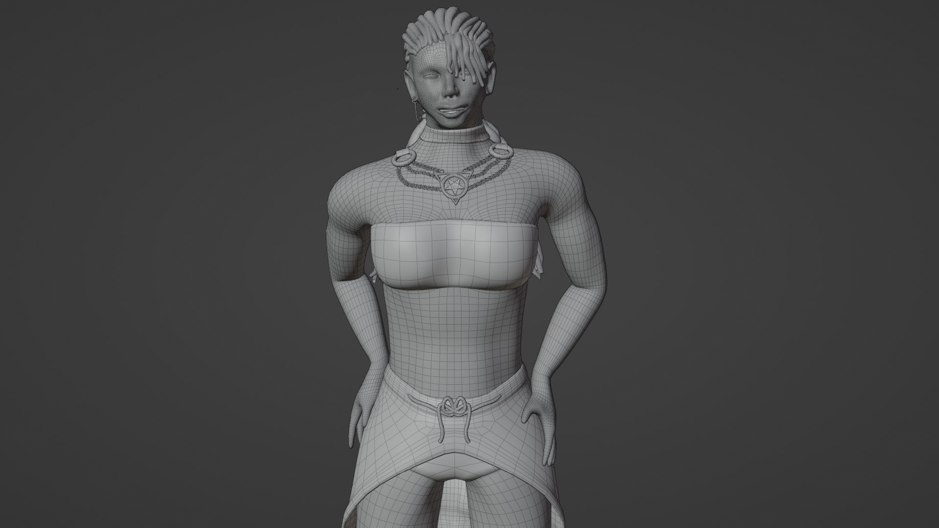 Most of the geometry on this model is already sound enough. The only area of contention in my mind is the Kelpie's rear. One of the aforementioned body shape changes was lifting her butt in order to make the thigh-torso connection look better. A consequence of this is that the topography of the tailbone is a little odd, but hopefully this would become an issue considering she is wearing pants.