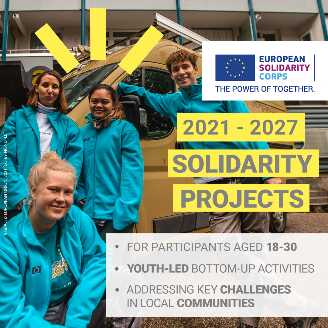 Pe 15 aprilie, Comisia Europeană a anunțat lansarea noului program european care urmărește promovarea solidarității prin proiecte de voluntariat – Corpul European de Solidaritate. Acesta are alocat un buget de 1 miliard de Euro, la nivelul tuturor țărilor participante, pentru perioada 2021-2027, suma urmând să ofere oportunități la nivel local și internațional pentru cel puțin 270.000 de tineri cu vârste între 18 și 30 de ani.