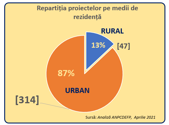 Dintre cele 361 de organizații finanțate de Erasmus+ în perioada 2014-2020, 14 sunt unități școlare speciale și incluzive, care se adresează elevilor cu nevoi speciale și personalului propriu (aproximativ 3,88%). 47 dintre organizatii se află în mediul rural. Din Figura C se poate vedea cum s-a repartizat numărul de proiecte de mobilitate pentru domeniul Educație și formare profesională din punctul de vedere al mediului de rezidență.