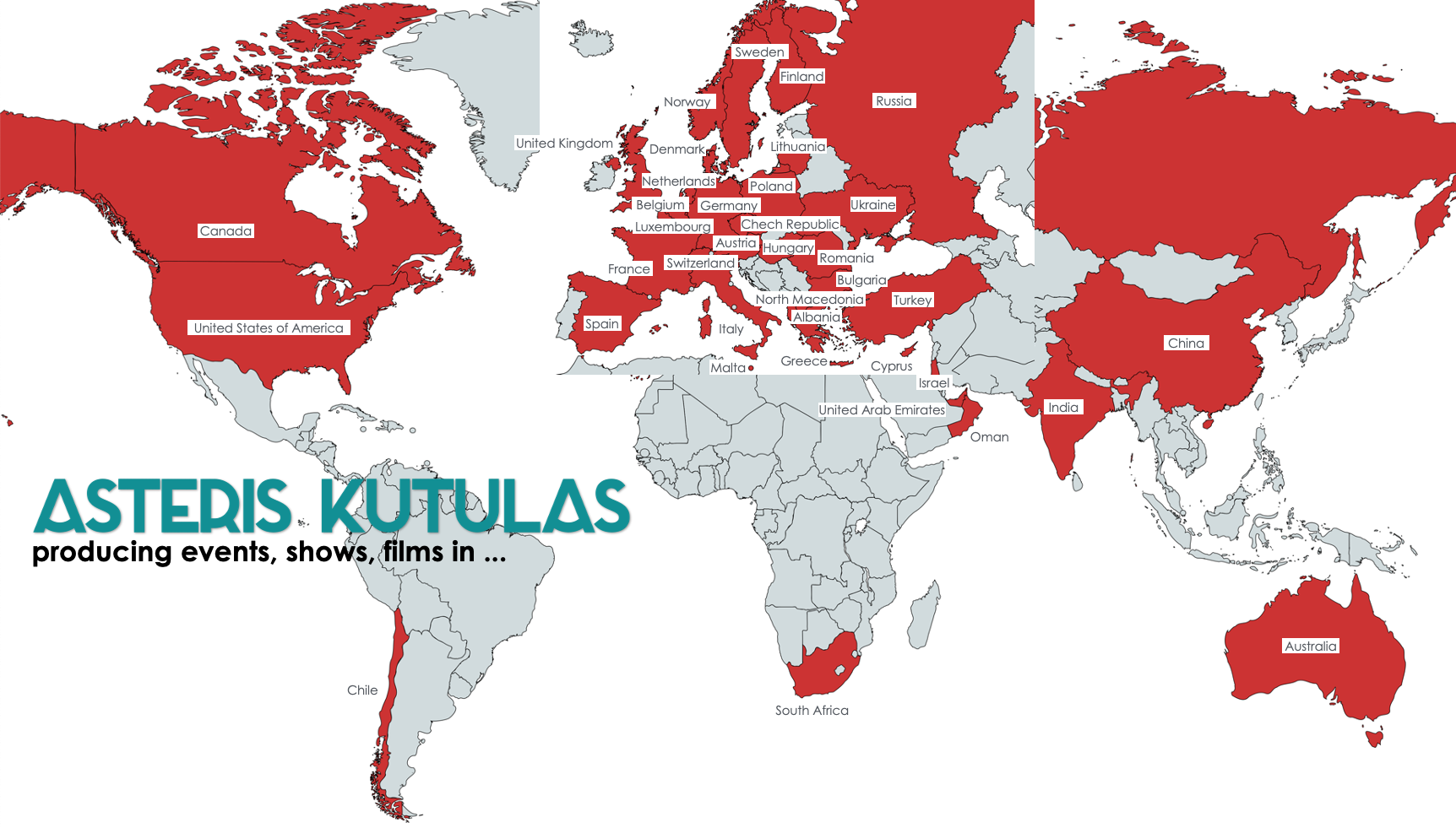 Asteris Kutulas has organized concerts and events of all genres, as well as opera and ballet performances, in dozens of countries worldwide for a large number of leading performing artists. Working as Event/Concert Producer, Tour Manager, Promoter, Agent or Production Manager for/with artists such as Mikis Theodorakis, Maria Farantouri, Zülfü Livaneli, the Scorpions, Mike Oldfield, Roger Waters, Milva, Sting, Buena Vista Social Club, Westbam, Kelly Family, Klaus Schulze, Demis Roussos, Charoula Alexiou, Anouk, George Dalaras, Vicky Leandros, Motörhead, Thomas Anders, Gabi Delgado etc.