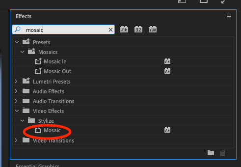 2. With your clip already imported, search for mosaic in the top right effects panel. Drag the one located in the "Stylize" folder onto your clip in the timeline