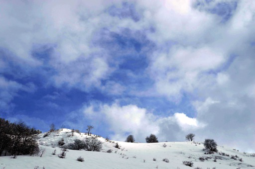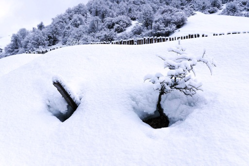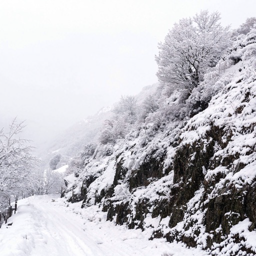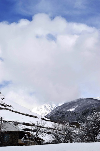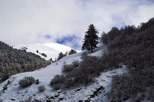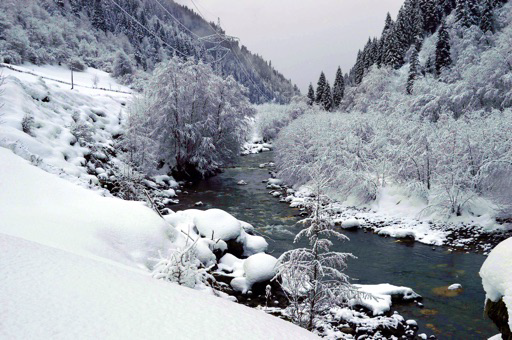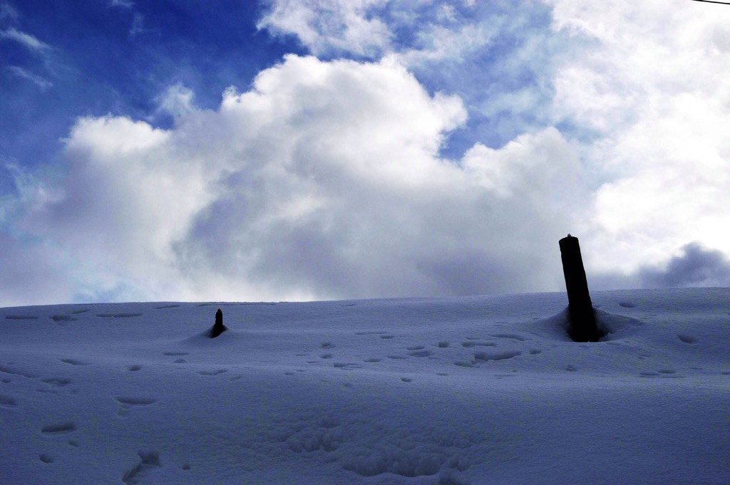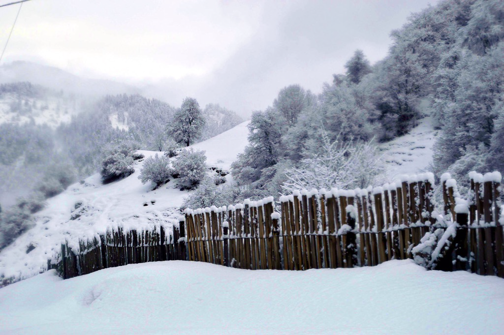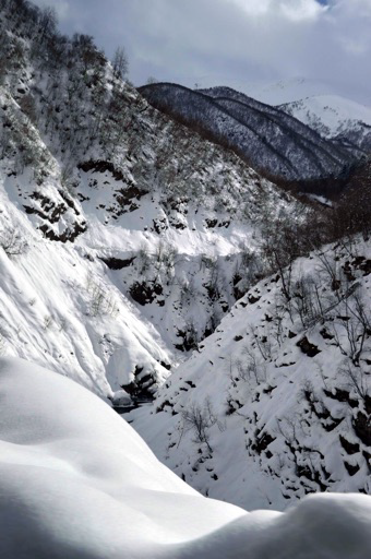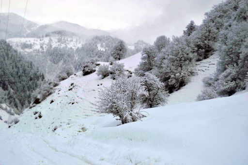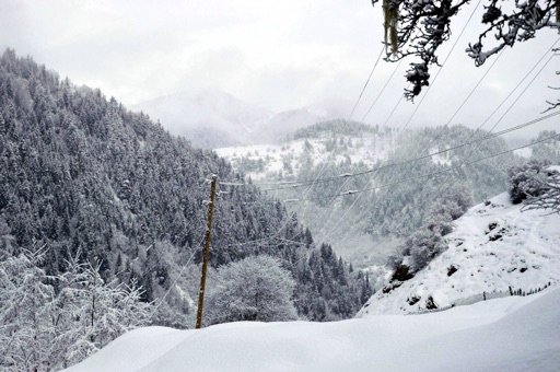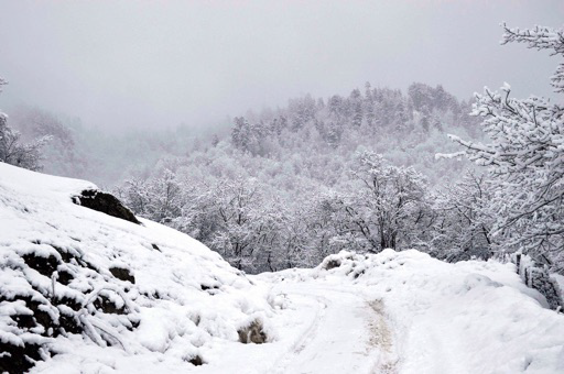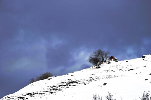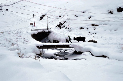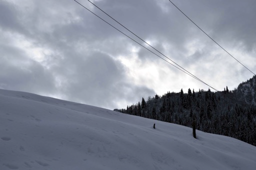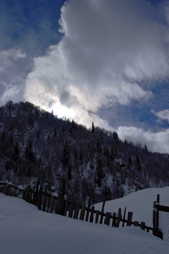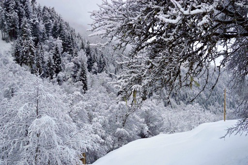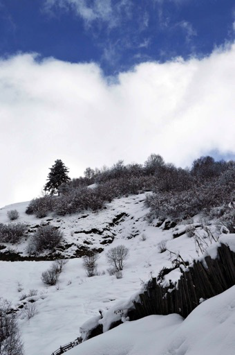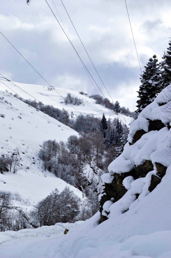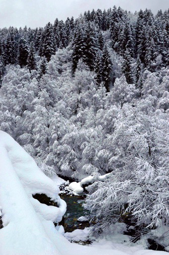 Al poco nos despedimos del primer piloto y subimos al jeep del sustituto. Como para señalar que se inicia un nuevo capítulo en la aventura, tras unas cuantas curvas el carácter de la carretera también cambia. Se hace más estrecha, un poco más burda, más traicionera. Tiene un grado menos de consolidación que el tramo anterior, con una gran pared de roca a nuestra izquierda y una caída amenazante a la derecha. A medida que el sol empieza a asomarse de manera intermitente tras la manta de nubes, una imagen como de otro mundo se despliega ante nosotros: montañas en fantasmales sudarios de nieve, erizadas de árboles negros, contra un cielo azul profundo, entreverado de nubes.