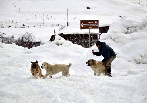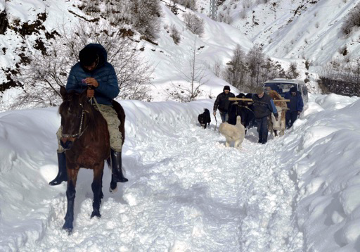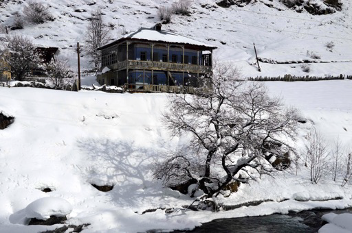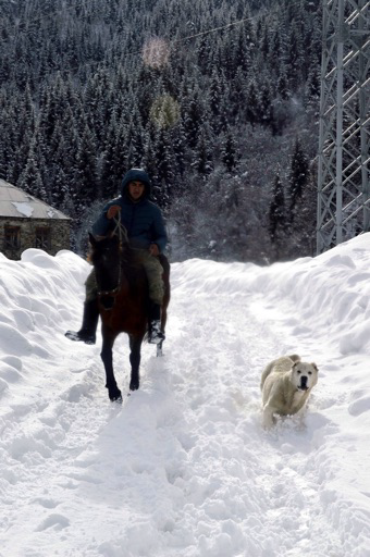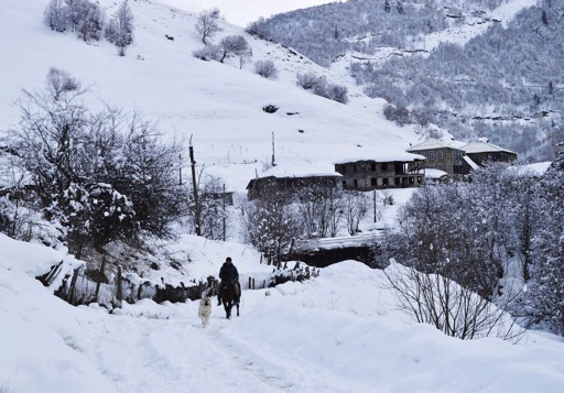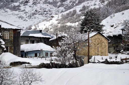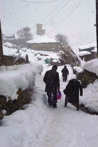 Finalmente, nos reunimos con el conductor en la carretera principal, en el núcleo superior de casas. Estamos ateridos y hambrientos, sin haber comido nada desde el desayuno. El conductor nos propone ir a casa de una gente que conoce, de modo que escalamos a resbalones y tropezones el sendero rocoso que aquí hacen pasar por calle de pueblo. De camino nos cruzamos con un grupito de niños que vuelven a casa al salir de la escuela local. Les acompaña un gran perro ovejero de raza caucásica y son guiados por dos muchachos que nos saludan con orgullo en inglés. Devolvemos el saludo dándoles la enhorabuena y sonríen corriendo sendero abajo.
