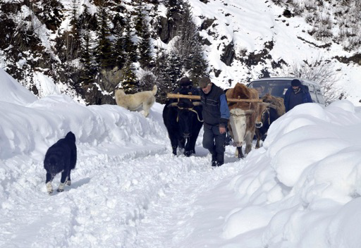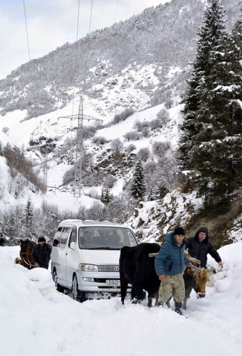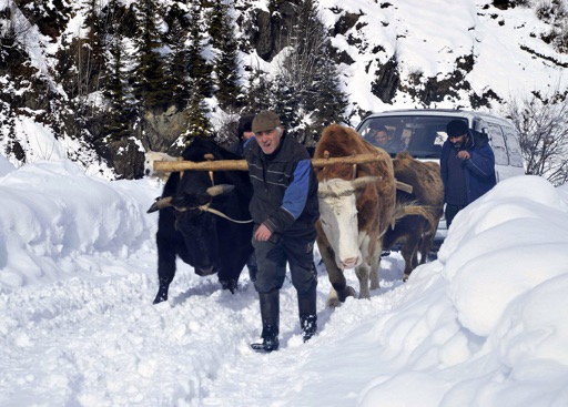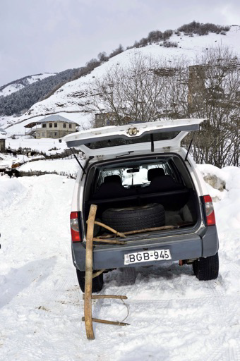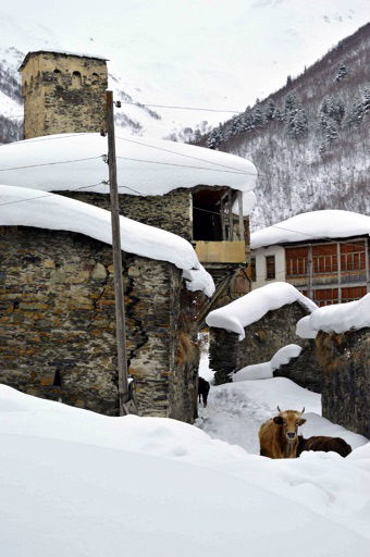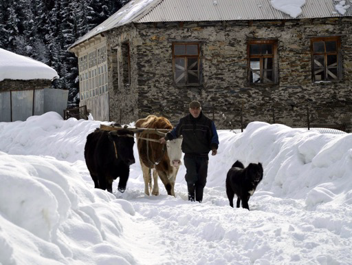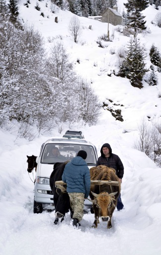 Decide hacer otra llamada, esta vez a un pariente suyo que vive en Mestia, para que venga y nos lleve él el resto del camino. Asistimos entonces admirados al espectáculo de nuestra difunta furgoneta remolcada por un yunta de cuatro bueyes, dos machos con cuernos, delante, que guían a dos vacas, detrás, por la carretera de montaña que sube a Kala, el pueblo más cercano, donde el nuevo conductor se reunirá con nosotros.