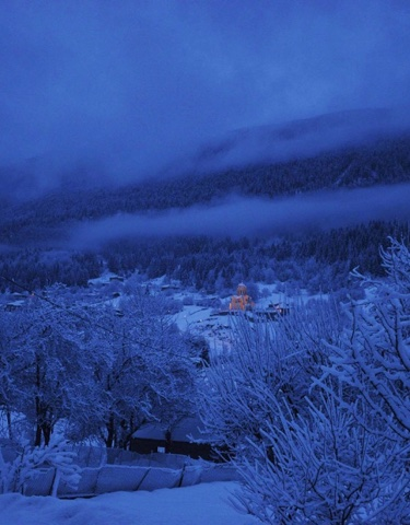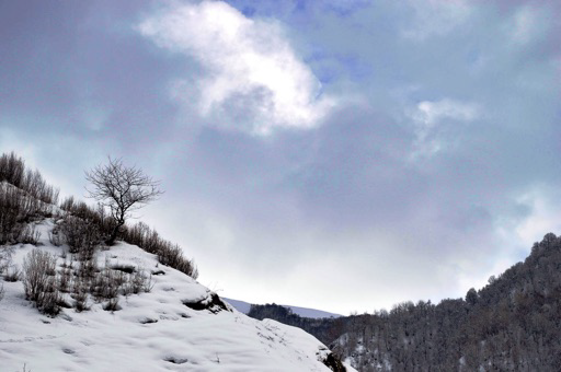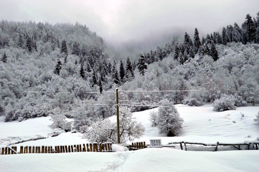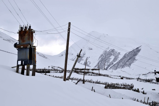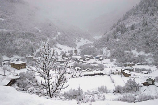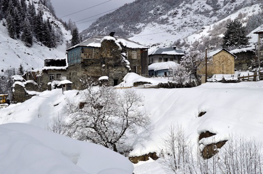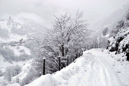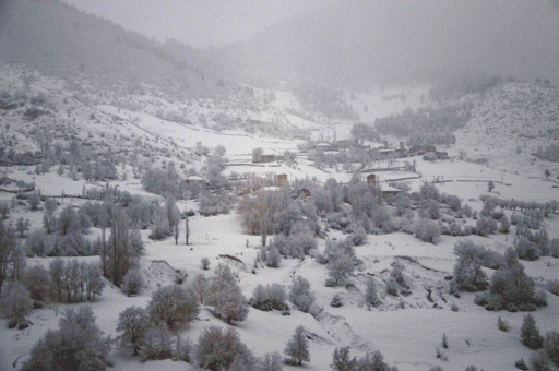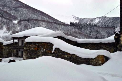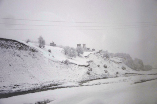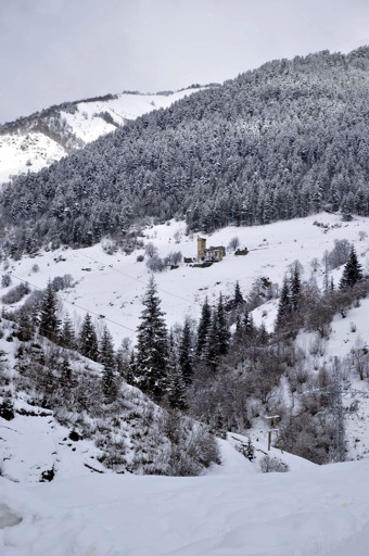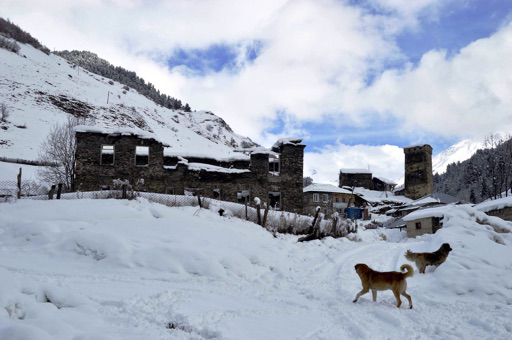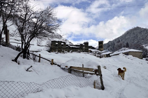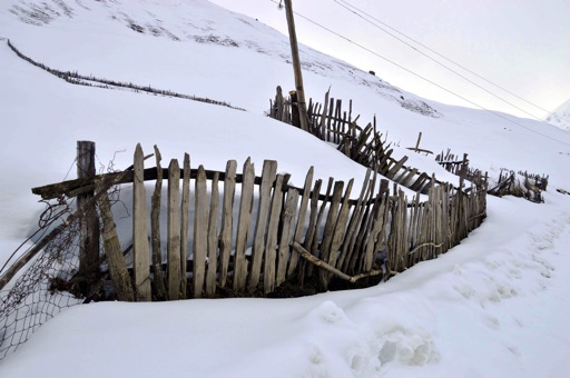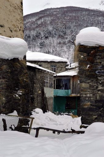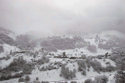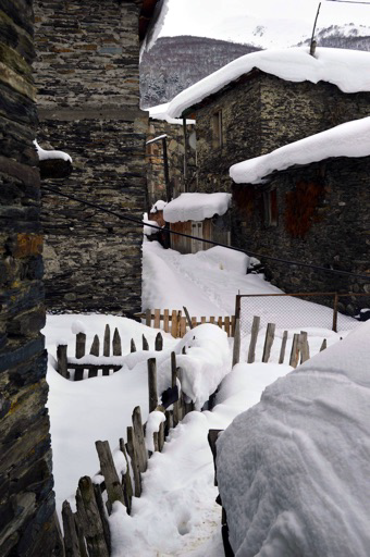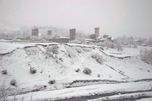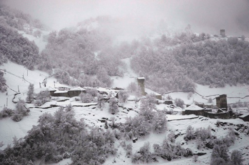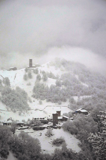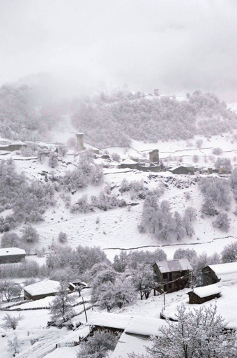 Abro los ojos antes del amanecer en el albergue en Mestia y veo que ha nevado durante la noche. Ni el más leve soplo de aire. En la luz neblinosa cada tejado, cada árbol, cada valla se perfila con una línea brillante de blanco puro. Un blanco de exquisita fragilidad sobre todas las formas, hasta en la rama más pequeña. Los cables eléctricos, combados con elegancia de poste a poste, se han convertido en gruesas cintas, la nieve se ha ido acomodando con cuidadoso equilibrio hasta alcanzar casi cuatro dedos de altura, una imposible tracería que la corriente más leve destruirá. Nos ponemos en marcha para Ushguli en una furgoneta todo terreno conducida por el dueño de la casa de huéspedes. Las calles de la ciudad están desiertas a esta hora, los charcos reflejan nuestros faros en un rosa helado. El carraspeo del motor alborota a los perros que aumentan sus gruñidos y nos persiguen ladrando por las calles de las afueras hasta convencerse de que no volveremos atrás.