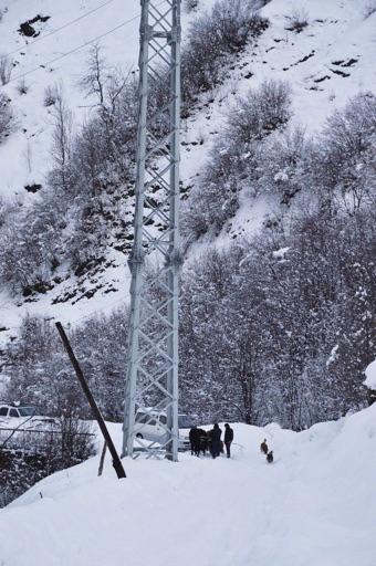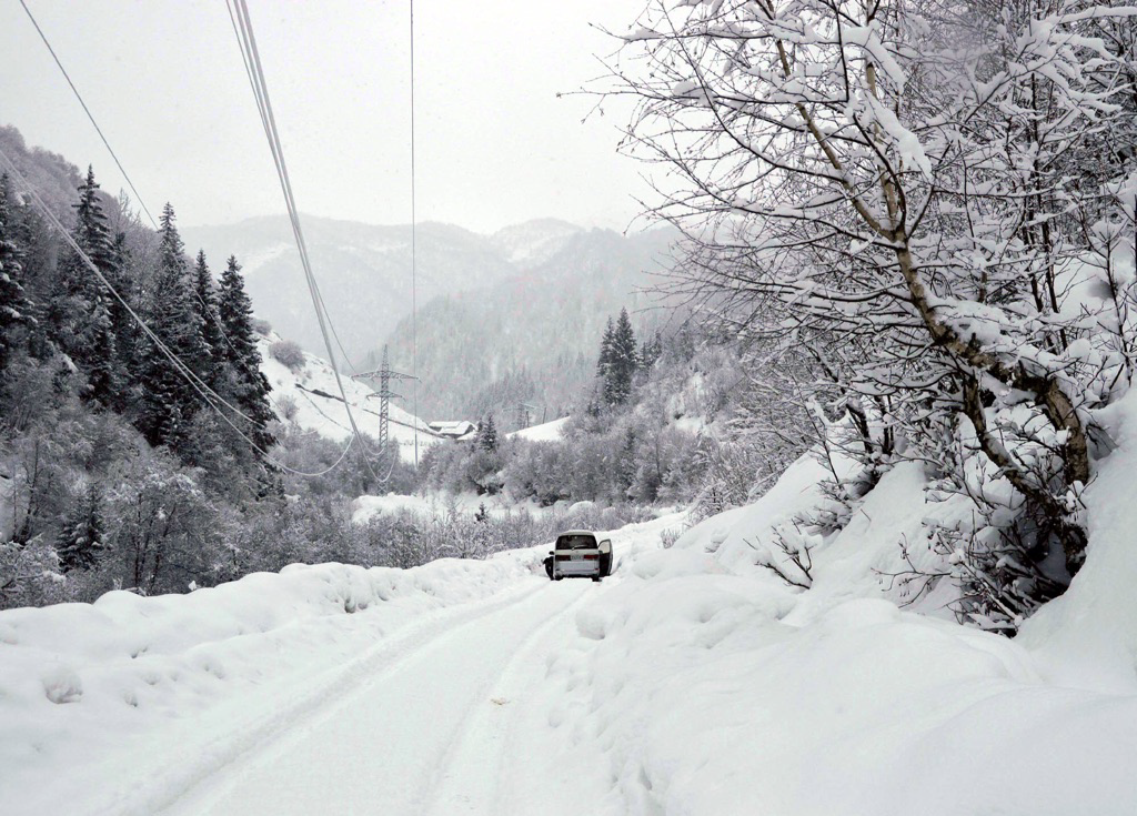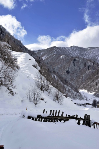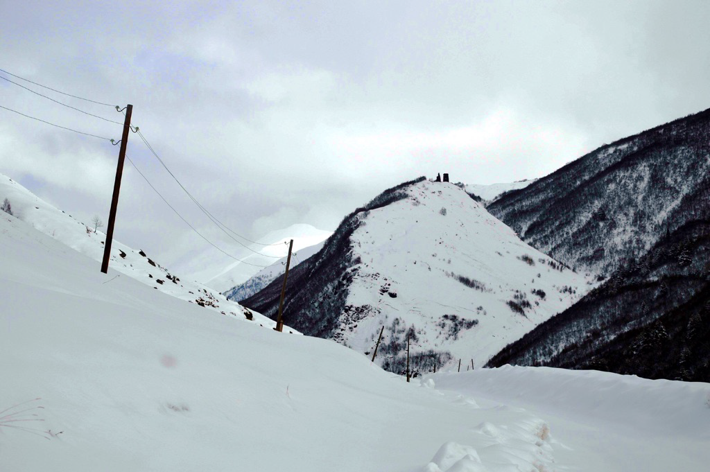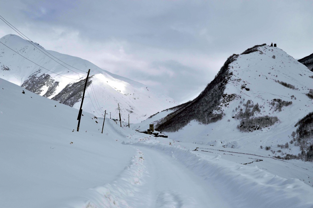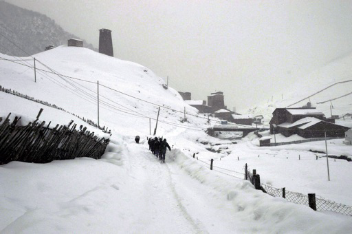 Al salir del pueblo nos encontramos en una carretera estrecha, tapada por la nieve que de vez en cuando se disuelve en regueros de fango. Corre ceñida a los contornos del valle del río Inguri, casi un torrente zigzagueante alimentado por los surcos que labran los regatos aleatorios del deshielo. Derrumbes, baches, piedras que nos hacen ir frenando o detenernos del todo cuando el conductor ha de salir a estudiar qué tipo de obstáculo se le ha puesto delante. Luego, manejando con habilidad el volante y las marchas cortas, vadea hasta el otro lado entre sacudidas y balanceos. Y seguimos. Así, de este modo, calculamos que recorrer los 40 km hasta Ushguli nos llevará tres o cuatro horas. A veces, en un paso especialmente malo hay que salir a empujar. Hundimos los pies en la nieve y con todas nuestras fuerzas ayudamos a los neumáticos, que giran inutilmente sobre la placa de hielo, a encontrar el agarre para poner de nuevo rumbo a Ushguli.